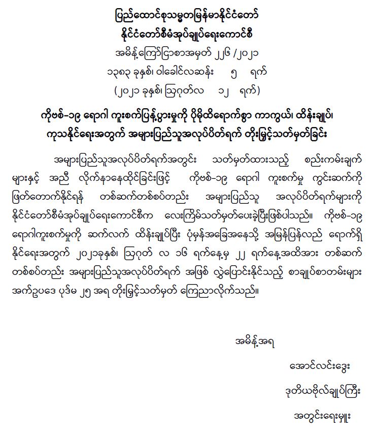 ကိုဗစ်-၁၉ ရောဂါ ကူးစက်ပြန့်ပွားမှုကို ပိုမိုထိရောက်စွာ ကာကွယ်၊ ထိန်းချုပ်၊ ကုသနိုင်ရေးအတွက် အများပြည်သူအလုပ်ပိတ်ရက် တိုးမြှင့်သတ်မှတ်ခြင်း