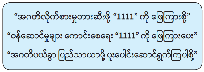 ၄။ သို့ဖြစ်ပါ၍ ပြည်သူလူထုအနေဖြင့် ကော်မရှင်နှင့် ပြည်ထောင်စုဝန်ကြီးဌာန/ အဖွဲ့အစည်းများရှိ အဂတိလိုက်စားမှု တားဆီးကာကွယ်ရေး အဖွဲ့များက Short Code “1111" ဖြင့် SMS ပေးပို့ မေးမြန်းလိုက်သောမေးခွန်းများကို ပြန်လည်ဖြေကြားပေးခြင်းသည် အဂတိလိုက်စားမှု တားဆီးကာကွယ်ရေး လုပ်ငန်းများတွင် တစ်ဖက်တစ်လမ်းမှ ပါဝင် ဆောင်ရွက်ခြင်းဖြစ်သဖြင့် အများပြည်သူထံမှ တုံ့ပြန်မှုရယူခြင်းအစီအစဉ် ကို အတူတကွ ပူးပေါင်းပါဝင်ဆောင်ရွက်စေလိုပါကြောင်း အသိပေးနှိုးဆော်တင်ပြအပ်ပါသည်။
