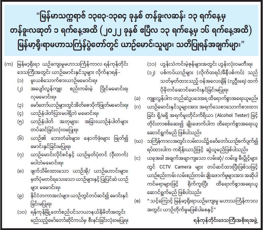 “ မြန်မာ့သက္ကရာဇ် ၁၃၈၃-၁၃၈၄ ခုနှစ် တန်ခူးလဆန်း ၁၃ ရက်နေ့မှ တန်ခူးလဆုတ် ၁ရက်နေ့အထိ (၂၀၂၂ ခုနှစ် ဧပြီလ ၁၃ ရက်နေ့မှ ၁၆ရက်နေ့အထိ) မြန်မာ့ရိုးရာမဟာသင်္ကြန်ပွဲတော်တွင် ယာဉ်မောင်းသူများ သတိပြုရန်အချက်များ 04/04/2022