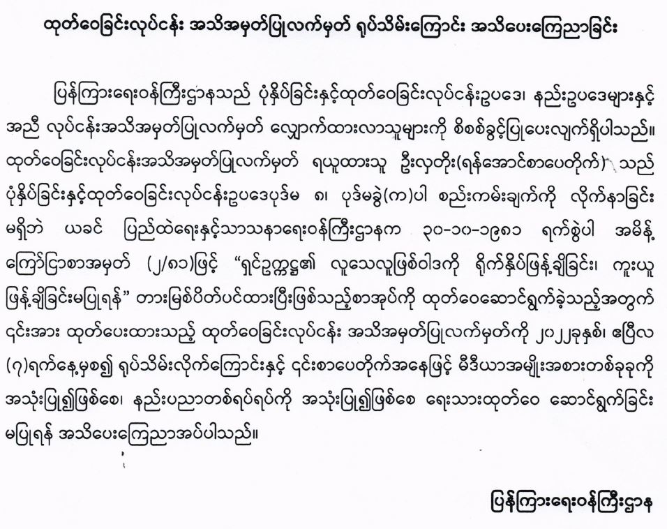 ထုတ်ဝေခြင်းလုပ်ငန်း အသိအမှတ်ပြုလက်မှတ် ရုပ်သိမ်းကြောင်း အသိပေးကြေညာခြင်း