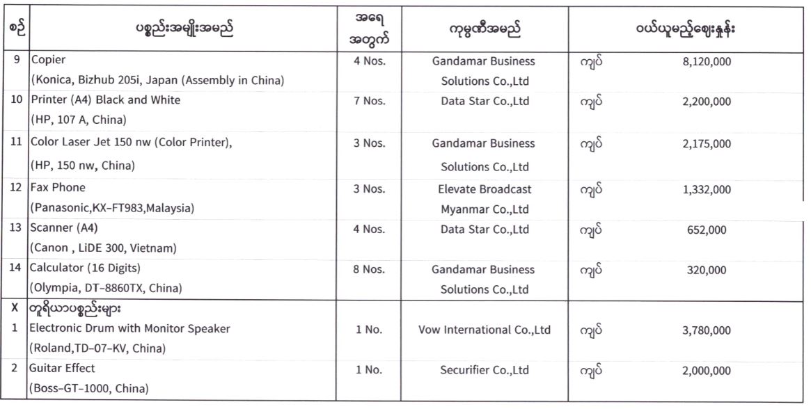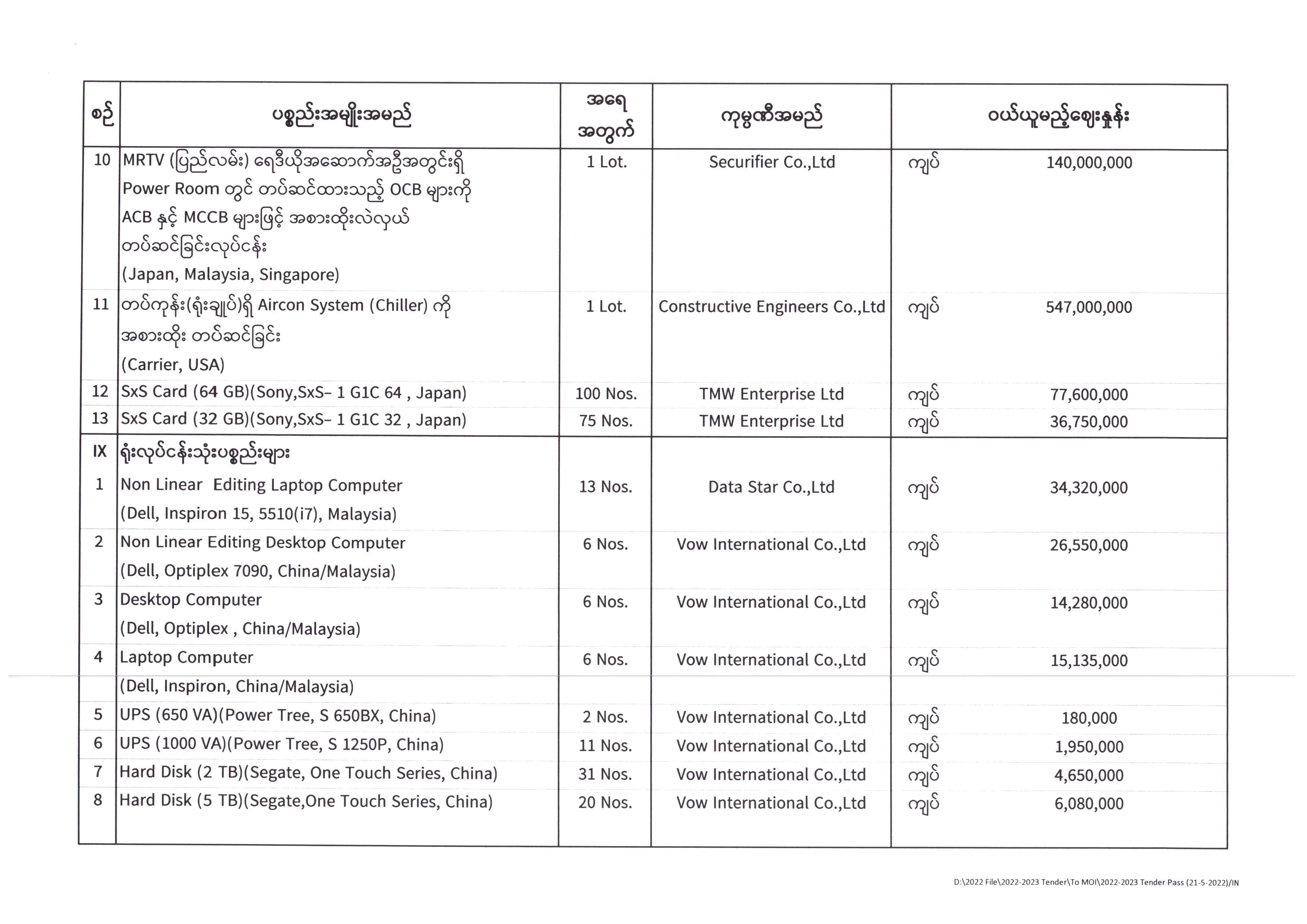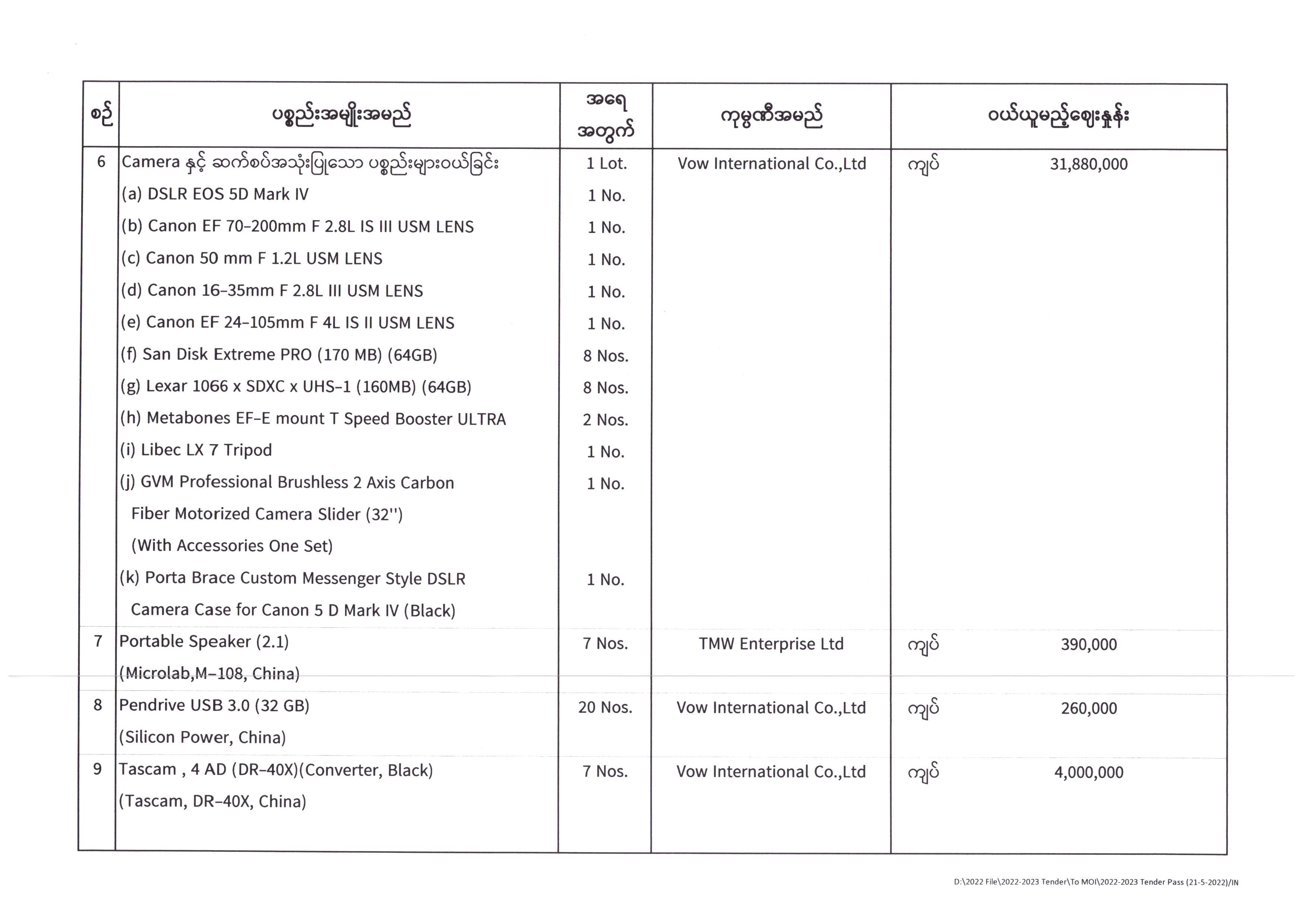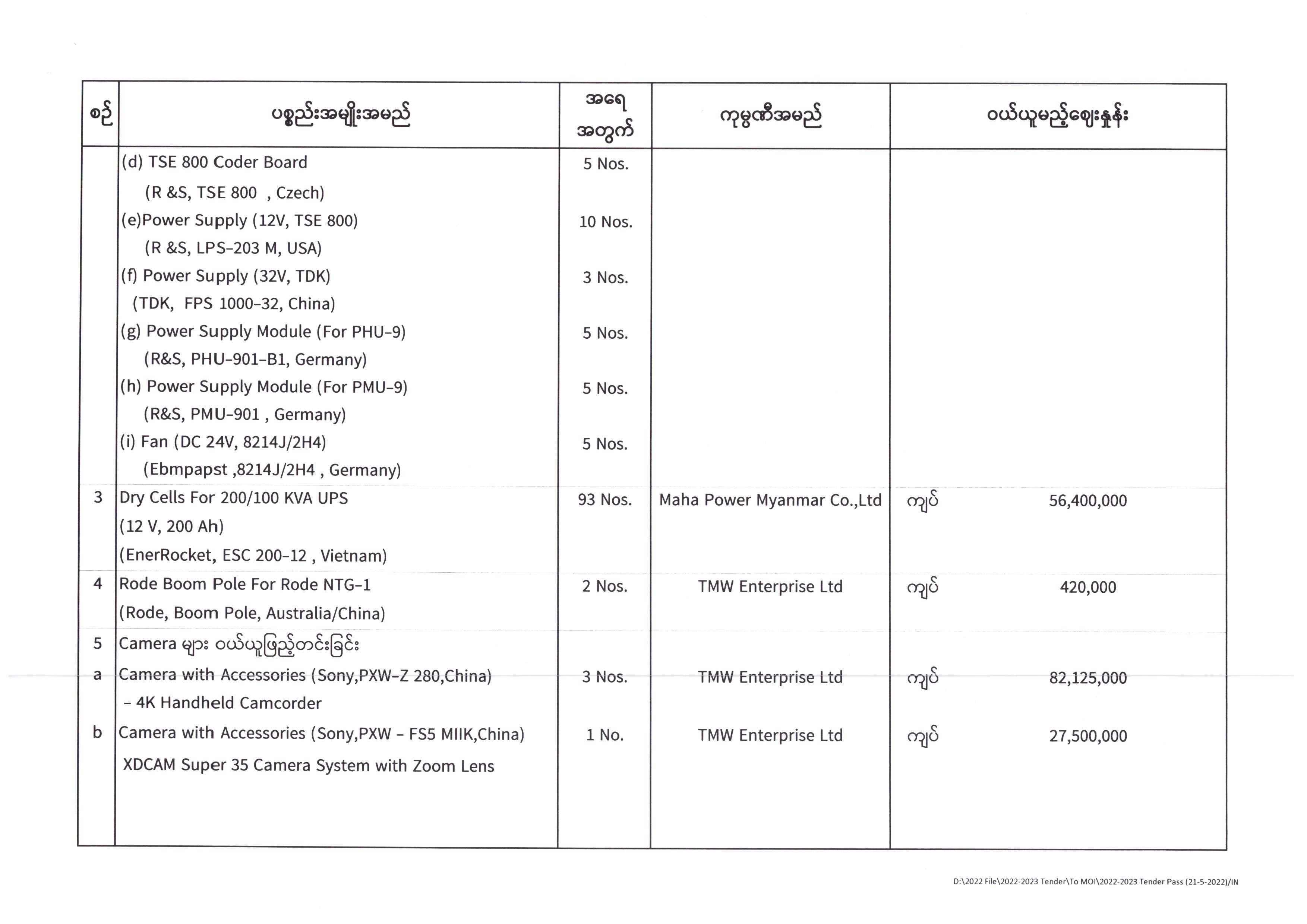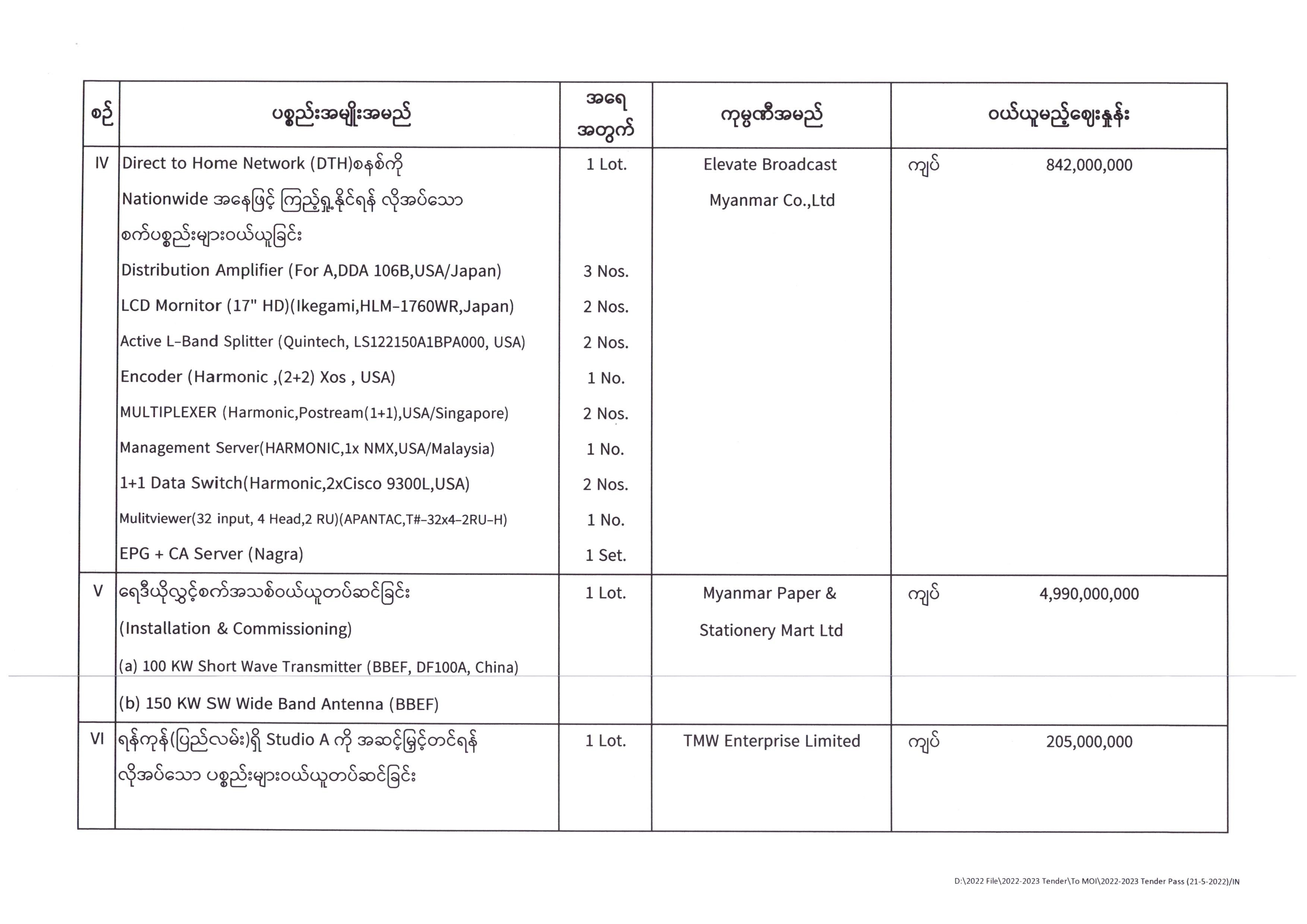 ပြန်ကြားရေးဝန်ကြီးဌာန၊ ပြည်တွင်း/ပြည်ပ ပစ္စည်းများဝယ်ယူရေးနှင့်ထုခွဲရောင်းချရေးကော်မတီအဖွဲ့၊ တင်ဒါအောင်မြင်ကြောင်းကြေညာခြင်း