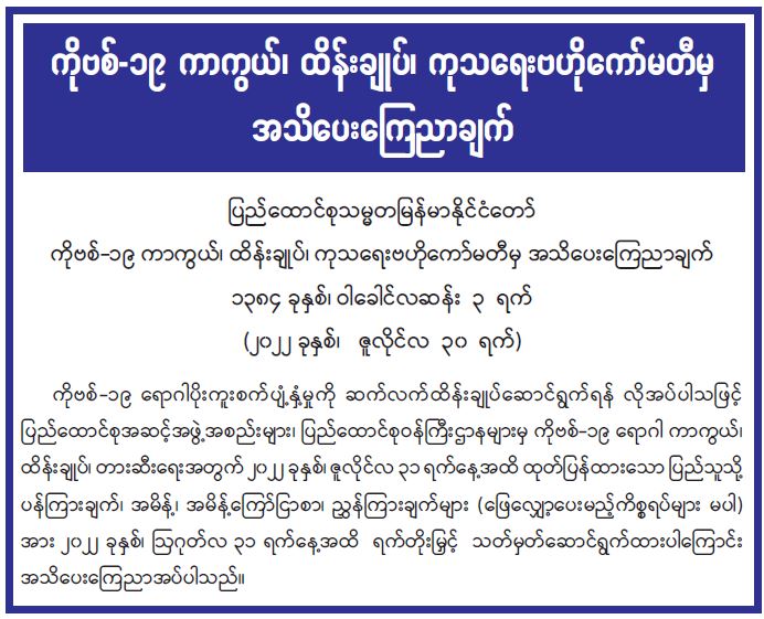 ကိုဗစ်-၁၉ ကာကွယ်၊ ထိန်းချုပ်၊ ကုသရေးဗဟိုကော်မတီမှ အသိပေးကြေညာချက်