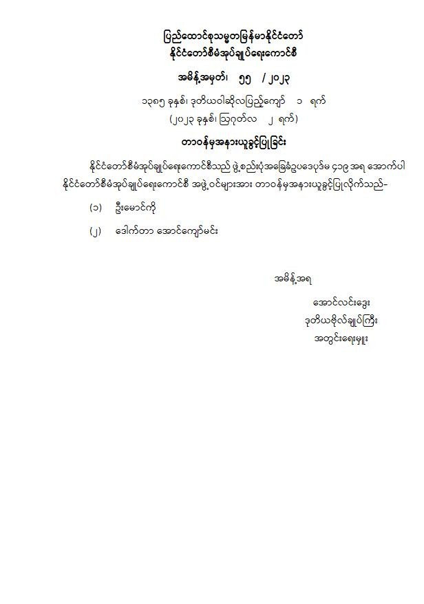 ပြည်ထောင်စုသမ္မတမြန်မာနိုင်ငံတော် နိုင်ငံတော်စီမံအုပ်ချုပ်ရေးကောင်စီ အမိန့်အမှတ်၊ ၅၅ / ၂၀၂၃ ၁၃၈၅ ခုနှစ်၊ ဒုတိယဝါဆိုလပြည့်ကျော် ၁ ရက် (၂၀၂၃ ခုနှစ်၊ ဩဂုတ်လ ၂ ရက်) တာဝန်မှအနားယူခွင့်ပြုခြင်း