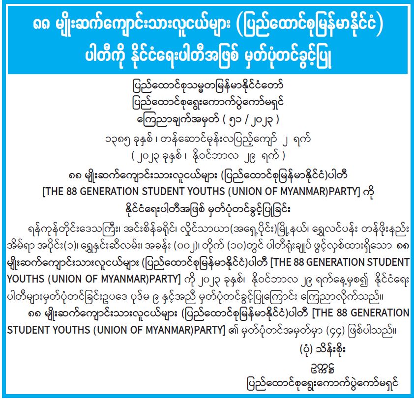 ၈၈ မျိုးဆက်ကျောင်းသားလူငယ်များ (ပြည်ထောင်စုမြန်မာနိုင်ငံ) ပါတီကို နိုင်ငံရေးပါတီအဖြစ် မှတ်ပုံတင်ခွင့်ပြု
