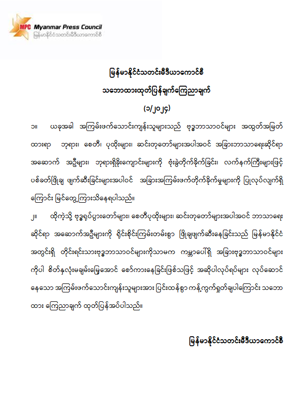 မြန်မာနိုင်ငံသတင်းမီဒီယာကောင်စီ သဘောထားထုတ်ပြန်ချက်ကြေညာချက် (၁/၂၀၂၄)