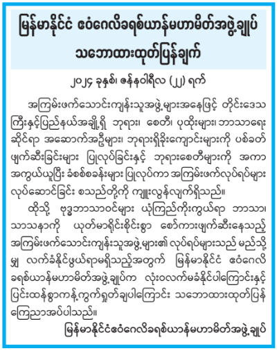 ထိုသို့ ဗုဒ္ဓဘာသာဝင်များ ယုံကြည်ကိုးကွယ်ရာ ဘာသာ၊ သာသနာကို ယုတ်မာရိုင်းစိုင်းစွာ စော်ကားဖျက်ဆီးနေသည့် အကြမ်းဖက်သောင်းကျန်းသူအဖွဲ့များ၏ လုပ်ရပ်များသည် မည်သို့ မျှ လက်ခံနိုင်ဖွယ်ရာမရှိသည့်အတွက် မြန်မာနိုင်ငံ ဧဝံဂေလိ ခရစ်ယာန်မဟာမိတ်အဖွဲ့ချုပ်က လုံးဝလက်မခံနိုင်ပါကြောင်းနှင့် ပြင်းထန်စွာကန့်ကွက်ရှုတ်ချပါကြောင်း သဘောထားထုတ်ပြန် ကြေညာအပ်ပါသည်။
