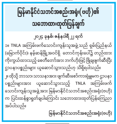 ၂။ ထိုသို့ ဘာသာ၊ သာသနာအား ဖျက်ဆီးစော်ကားရုံမျှမက ဌာပနာပစ္စည်းများအား ယူဆောင်သွားသည့် TNLA အကြမ်းဖက် သောင်းကျန်းသူအဖွဲ့အား မြန်မာနိုင်ငံသဘင်အစည်းအရုံး(ဗဟို)က ပြင်းထန်စွာရှုတ်ချပါကြောင်း သဘောထားထုတ်ပြန်ကြေညာ အပ်ပါသည်။