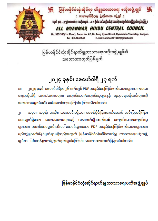 မြန်မာနိုင်ငံလုံးဆိုင်ရာ ဟိန္ဒူဘာသာရေးဗဟိုအဖွဲ့ချုပ် သဘောထားထုတ်ပြန်ချက်