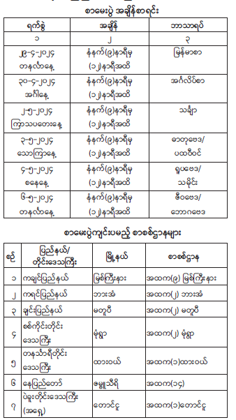 ၂။ အဆိုပါ အထူးအစီအစဉ်တစ်ရပ်အနေဖြင့် ကျင်းပဆောင်ရွက်မည့် တက္ကသိုလ်ဝင်စာမေးပွဲ အချိန်စာရင်းနှင့် စာစစ်ဌာနများစာရင်းကို အောက်ပါအတိုင်း ကြေညာအပ်ပါသည်။