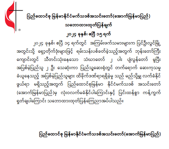 ပြည်ထောင်စု မြန်မာနိုင်ငံမက်သဒစ်အသင်းတော် (အောက်မြန်မာပြည်) သဘောထားထုတ်ပြန်ချက်