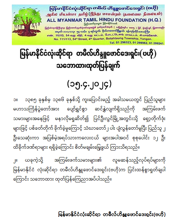 မြန်မာနိုင်ငံလုံးဆိုင်ရာ တမီလ်ဟိန္ဒူဖောင်ဒေးရှင်း (ဗဟို) သဘောထားထုတ်ပြန်ချက်