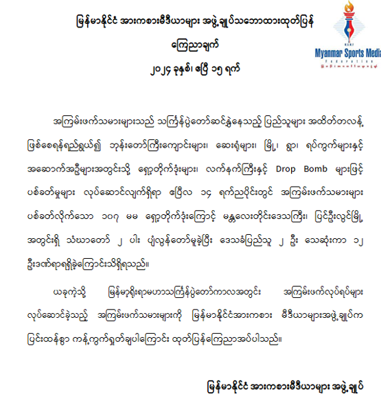 မြန်မာနိုင်ငံအားကစားမီဒီယာများ အဖွဲ့ချုပ် သဘောထားထုတ်ပြန်ကြေညာချက်