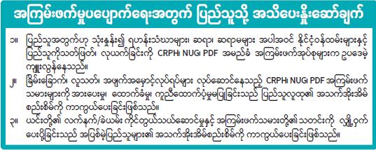 ၂။ ခြိမ်းခြောက်၊ လူသတ်၊ အဖျက်အမှောင့်လုပ်ရပ်များ လုပ်ဆောင်နေသည့် CRPH၊ NUG၊ PDF အကြမ်းဖက် သမားများကို အားပေးမှု၊ ထောက်ခံမှု၊ ကူညီထောက်ပံ့မှုမပြုခြင်းသည် ပြည်သူလူထု၏ အသက်အိုးအိမ်စည်းစိမ်ကို ကာကွယ်ပေးခြင်းဖြစ်သည်။