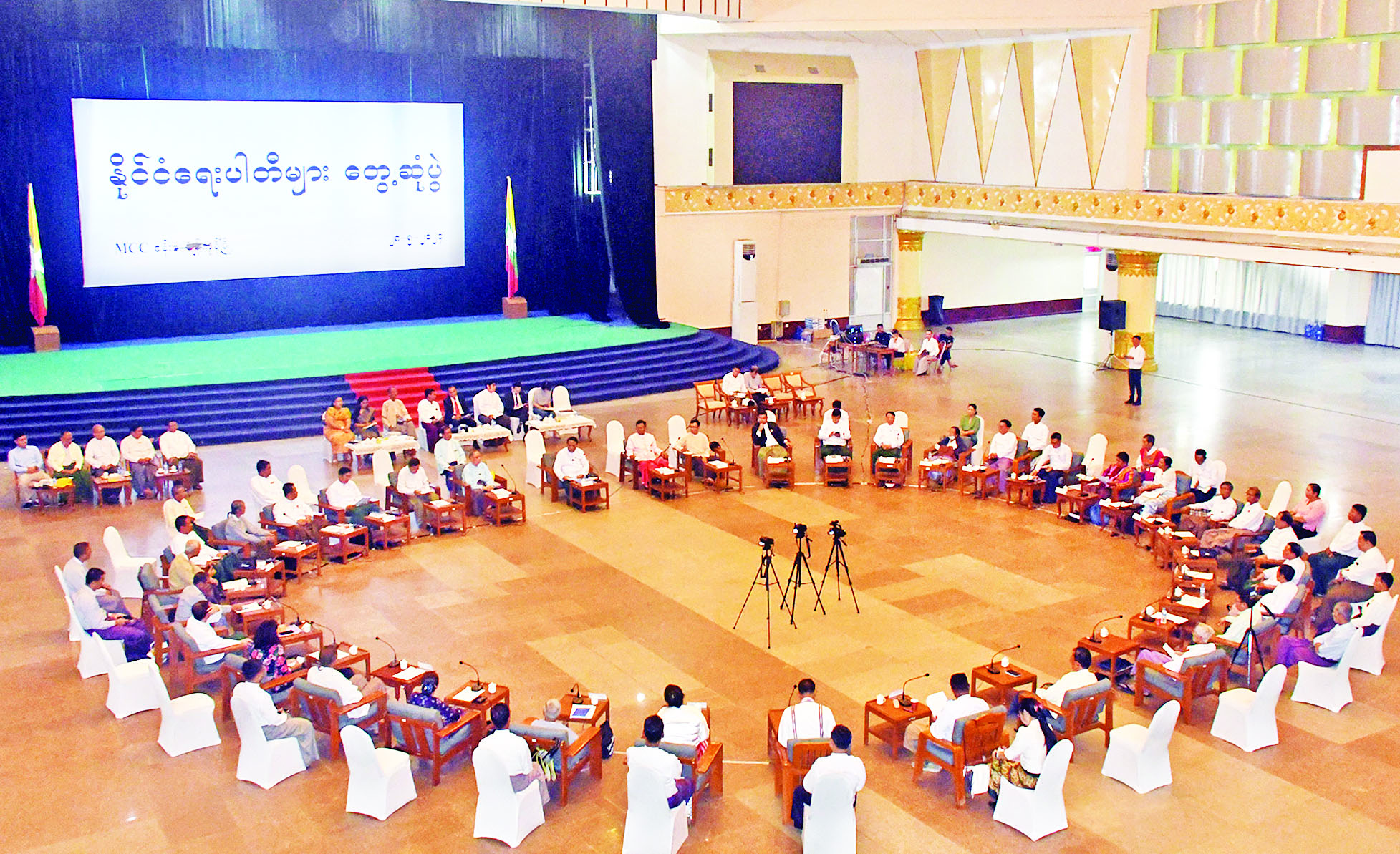 မြန်မာနိုင်ငံအပေါ် အရေးယူပိတ်ဆို့မှု (Sanctions)နှင့်စပ်လျဉ်း၍ နိုင်ငံရေးပါတီများ တွေ့ဆုံဆွေးနွေးပွဲကို ယနေ့နံနက် ၁၀ နာရီက ရန်ကုန်မြို့ မရမ်းကုန်းမြို့နယ် မင်းဓမ္မလမ်းရှိ မြန်မာကွန်ဗင်းရှင်းစင်တာ(MCC) ခန်းမ၌ ကျင်းပသည်။