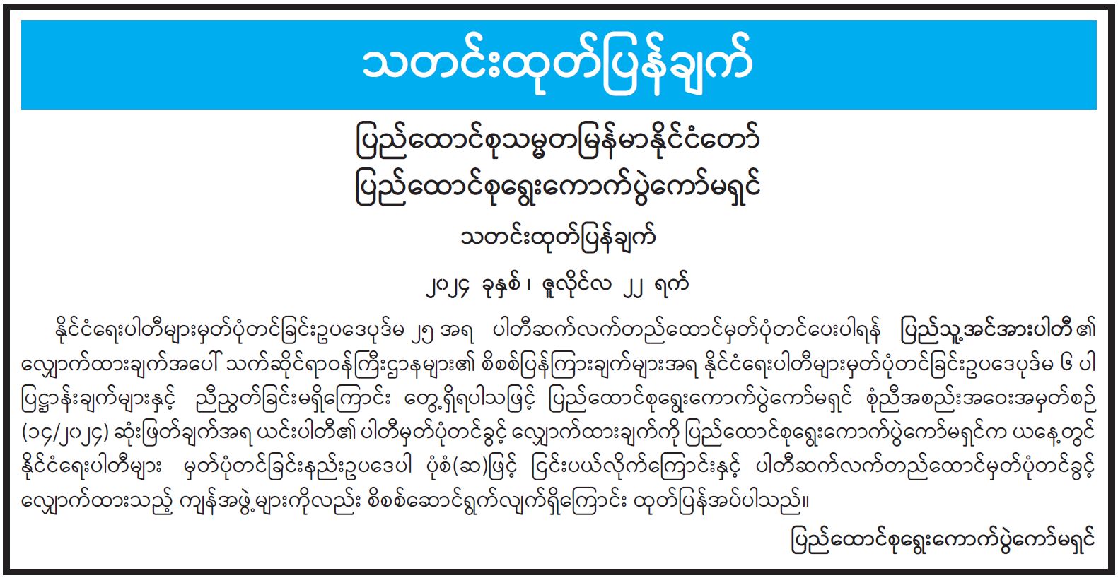 နိုင်ငံရေးပါတီများမှတ်ပုံတင်ခြင်းဥပဒေပုဒ်မ ၂၅ အရ ပါတီဆက်လက် တည်ထောင်မှတ်ပုံတင်ပေးပါရန် ပြည်သူ့အင်အားပါတီ ၏ လျှောက်ထားချက်အပေါ် သက်ဆိုင်ရာဝန်ကြီးဌာနများ၏ စိစစ်ပြန်ကြားချက်များအရ နိုင်ငံရေးပါတီများ မှတ်ပုံတင်ခြင်းဥပဒေပုဒ်မ ၆ ပါ ပြဋ္ဌာန်းချက်များနှင့် ညီညွတ်ခြင်းမရှိကြောင်း တွေ့ရှိရပါသဖြင့် ပြည်ထောင်စုရွေးကောက်ပွဲကော်မရှင် စုံညီအစည်းအဝေးအမှတ်စဉ် (၁၄/၂၀၂၄) ဆုံးဖြတ်ချက်အရ ယင်းပါတီ၏ ပါတီမှတ်ပုံတင်ခွင့် လျှောက်ထားချက်ကို ပြည်ထောင်စုရွေးကောက်ပွဲကော်မရှင်က ယနေ့တွင် နိုင်ငံရေးပါတီများ မှတ်ပုံတင်ခြင်းနည်းဥပဒေပါ ပုံစံ(ဆ)ဖြင့် ငြင်းပယ်လိုက်ကြောင်းနှင့် ပါတီဆက်လက် တည်ထောင်မှတ်ပုံတင်ခွင့် လျှောက်ထားသည့် ကျန်အဖွဲ့များကိုလည်း စိစစ်ဆောင်ရွက်လျက်ရှိကြောင်း ထုတ်ပြန်အပ်ပါသည်။