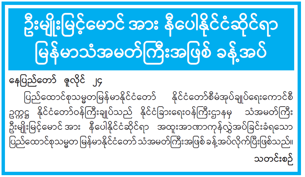 ပြည်ထောင်စုသမ္မတမြန်မာနိုင်ငံတော် နိုင်ငံတော်စီမံအုပ်ချုပ်ရေးကောင်စီဥက္ကဋ္ဌ နိုင်ငံတော်ဝန်ကြီးချုပ်သည် နိုင်ငံခြားရေးဝန်ကြီးဌာနမှ သံအမတ်ကြီး ဦးမျိုးမြင့်မောင်အား နီပေါနိုင်ငံဆိုင်ရာ အထူးအာဏာကုန်လွှဲအပ်ခြင်းခံရသော ပြည်ထောင်စုသမ္မတမြန်မာနိုင်ငံတော် သံအမတ်ကြီးအဖြစ် ခန့်အပ်လိုက်ပြီးဖြစ်သည်။