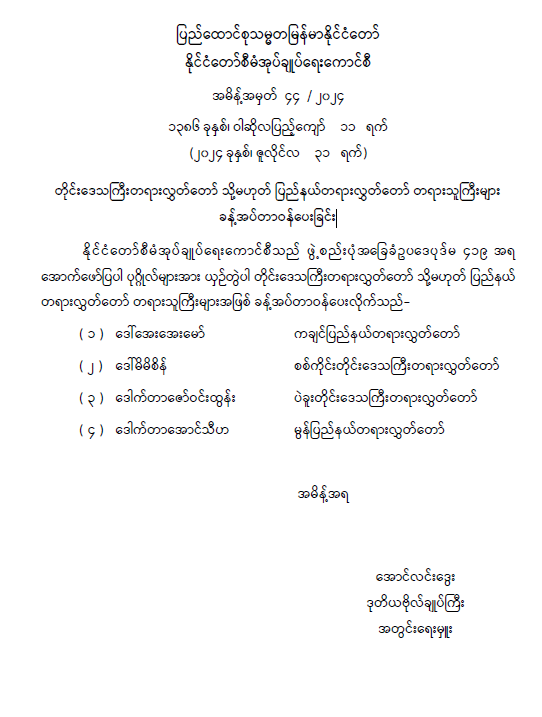 တိုင်းဒေသကြီးတရားလွှတ်တော် သို့မဟုတ် ပြည်နယ်တရားလွှတ်တော် တရားသူကြီးများ ခန့်အပ်တာဝန်ပေးခြင်း 07/31/2024