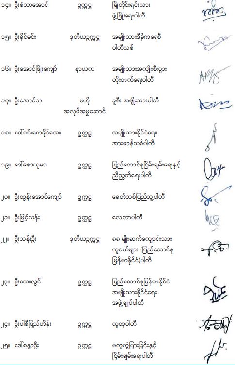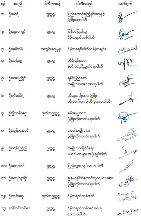၅။ သို့ဖြစ်ပါ၍ MNDAA ၊ TNLA နှင့် AA လက်နက်ကိုင်အဖွဲ့များကို အကြမ်းဖက်အုပ်စုအဖြစ် ကြေညာခြင်းအား သန်းပေါင်းများစွာသောပြည်သူများကိုယ်စား မိမိတို့နိုင်ငံရေးပါတီများက အပြည့်အဝထောက်ခံပါကြောင်းနှင့် အကြမ်းဖက်အုပ်စုများနှင့် ၎င်းတို့၏အကြမ်းဖက်လုပ်ရပ်များကို ထာဝရဆန့်ကျင်သွားမည်ဖြစ်ကြောင်း အောက်တွင်လက်မှတ်ရေးထိုး ပူးတွဲသဘောထားထုတ်ပြန်ကြေညာအပ်ပါသည်။