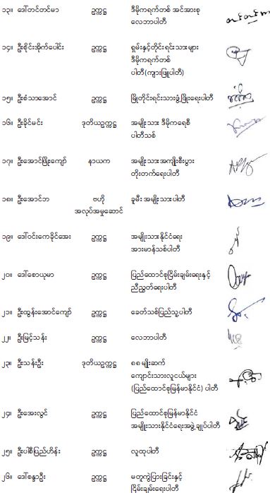 ၆။ သို့ပါ၍ အထက်အပိုဒ်ပါ ထုတ်ပြန်ကမ်းလှမ်းချက်သည် ပြည်သူတစ်ရပ်လုံး၏ အမှန်တကယ်လိုလားချက်အားကိုယ်စားပြုရာရောက်သည့် နိုင်ငံတော်၏ အပြုသဘောဆောင်သော ကမ်းလှမ်းချက်ဖြစ်သောကြောင့်လည်းကောင်း၊ နိုင်ငံတော်နှင့် နိုင်ငံသားအားလုံး၏ အကျိုးကို ရှေးရှုသော လိုက်နာပူးပေါင်းဆောင်ရွက်သင့်သည့် လုပ်ငန်းစဉ်တစ်ရပ်ဖြစ်ကြောင်း ရှုမြင်ပါသဖြင့် ၎င်းထုတ်ပြန်ချက်အပေါ် ကျွန်ုပ်တို့နိုင်ငံရေးပါတီများက အပြည့်အဝထောက်ခံအပ်ပါကြောင်း ပူးတွဲသဘောထားထုတ်ပြန်အပ်ပါသည်။
