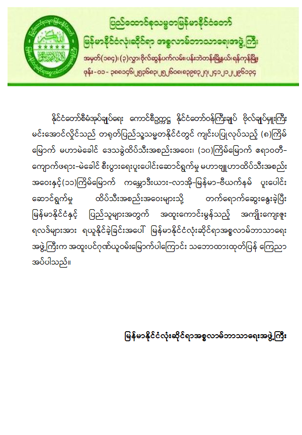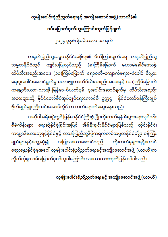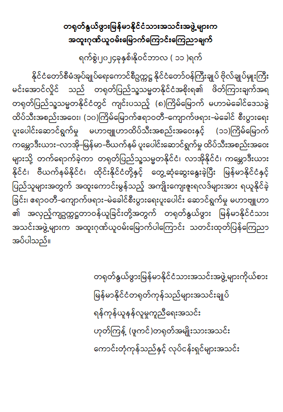 နိုင်ငံတော်စီမံအုပ်ချုပ်ရေးကောင်စီဥက္ကဋ္ဌ နိုင်ငံတော်ဝန်ကြီးချုပ် ဗိုလ်ချုပ်မှူးကြီး မင်းအောင်လှိုင်၏ တရုတ်နိုင်ငံခရီးစဉ်တွင် နိုင်ငံတော်အတွက် ကဏ္ဍစုံဖွံ့ဖြိုးတိုးတက်အောင် ကြိုးပမ်းဆောင်ရွက်ခဲ့မှုအပေါ် အဖွဲ့အစည်းများမှ ဂုဏ်ယူဝမ်းမြောက်ကြောင်း ထုတ်ပြန်ကြေညာ