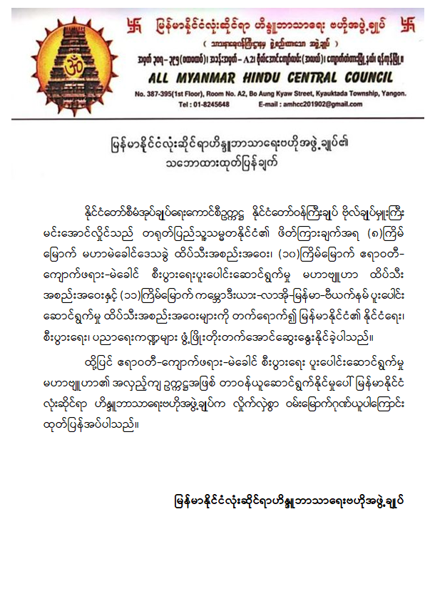 ထိုသို့ နိုင်ငံတော်စီမံအုပ်ချုပ်ရေးကောင်စီဥက္ကဋ္ဌ နိုင်ငံတော်ဝန်ကြီးချုပ် ဗိုလ်ချုပ်မှူးကြီး မင်းအောင်လှိုင်၏ မြန်မာနိုင်ငံကဏ္ဍစုံဖွံ့ဖြိုးတိုးတက်စေရန်အတွက် ကြိုးပမ်းဆောင်ရွက်နိုင်ခဲ့မှုအပေါ် မြန်မာ-တရုတ် ပူးပေါင်းဆက်ဆံရေးဗဟိုအသင်း၊ တရုတ်နွယ်ဖွားမြန်မာနိုင်ငံသားအသင်းအဖွဲ့များ၊ ဘာသာပေါင်းစုံချစ်ကြည်ညီညွတ်ရေးအဖွဲ့(ဗဟို)၊ လူမျိုးပေါင်းစုံညီညွတ်ရေးနှင့်အကျိုးဆောင်အဖွဲ့(ယာယီ)၊ မြန်မာနိုင်ငံဧဝံဂေလိခရစ်ယာန်မဟာမိတ်အဖွဲ့ချုပ်၊ ပြည်ထောင်စုမြန်မာနိုင်ငံမက်သဒစ်အသင်းတော် (အောက်မြန်မာပြည်)၊ မြန်မာနိုင်ငံလုံးဆိုင်ရာဟိန္ဒူဘာသာရေးဗဟိုအဖွဲ့ချုပ်၊ မြန်မာနိုင်ငံလုံးဆိုင်ရာတမီလ်ဟိန္ဒူဖောင်ဒေးရှင်း(ဗဟို)နှင့် မြန်မာနိုင်ငံလုံးဆိုင်ရာအစ္စလာမ်ဘာသာရေးအဖွဲ့ကြီးတို့မှ ဂုဏ်ယူဝမ်းမြောက်ပါကြောင်း သဘောထားထုတ်ပြန်ကြေညာခဲ့ကြကြောင်း သတင်းရရှိသည်။