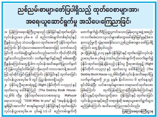 ၂။ ပုံနှိပ်သူ ဦးရာဇာရဲထွဋ် (Right ပုံနှိပ်တိုက်-၀၁၃၃၇) နှင့် ထုတ်ဝေသူ ဒေါ်စိန်ကြည် (The Destiny Book House- ၀၃၂၆၆) တို့မှ ပုံနှိပ်ထုတ်ဝေသောစာရေးသူ Mahuyar ရေးသားသည့် "1500 Miles to you" နှင့် “အမုန်းနဲ့ပျိုးတဲ့ ချစ်ခြင်းအလင်္ကာ” စာအုပ်များတွင် ပုံနှိပ်ခြင်းနှင့်ထုတ်ဝေခြင်း လုပ်ငန်းဥပဒေပုဒ်မ ၈၊ ပုဒ်မခွဲ (ဂ) ပါ စည်းကမ်းချက်ကိုဖောက်ဖျက်၍ ဟီရိဩတ္တပ္ပကင်းသော၊ မြန်မာ့လူ့အဖွဲ့အစည်းက လက်မခံသော၊ လူငယ်များ၏ တွေးခေါ်မြော်မြင်မှုနှင့်ခံစား နားလည်မှုကို လွဲမှားစေနိုင်သော ညစ်ညမ်းစာများ ဖော်ပြပါရှိကြောင်း တွေ့ရှိရပါသည်။