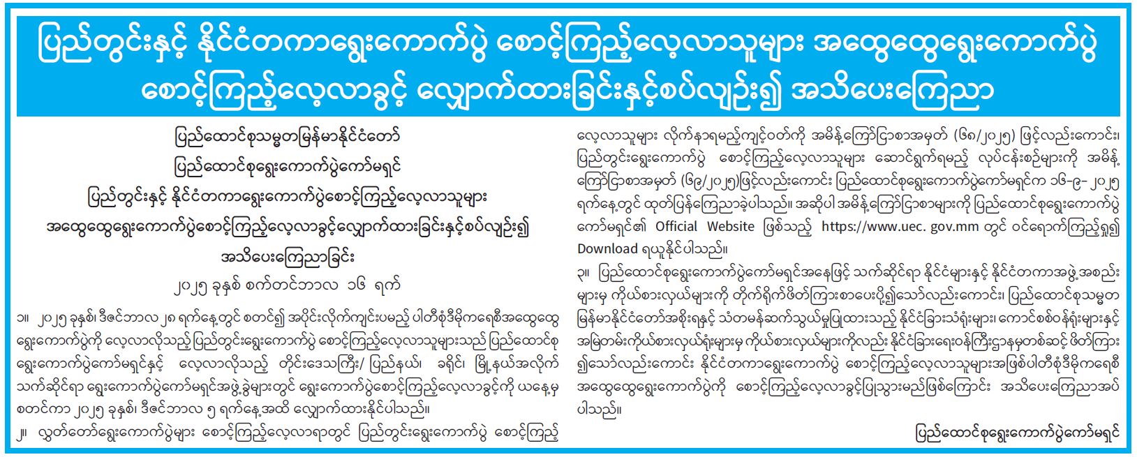 ပြည်တွင်းနှင့် နိုင်ငံတကာရွေးကောက်ပွဲ စောင့်ကြည့်လေ့လာသူများ အထွေထွေရွေးကောက်ပွဲ စောင့်ကြည့်လေ့လာခွင့် လျှောက်ထားခြင်းနှင့်စပ်လျဉ်း၍ အသိပေးကြေညာ 09/17/2025