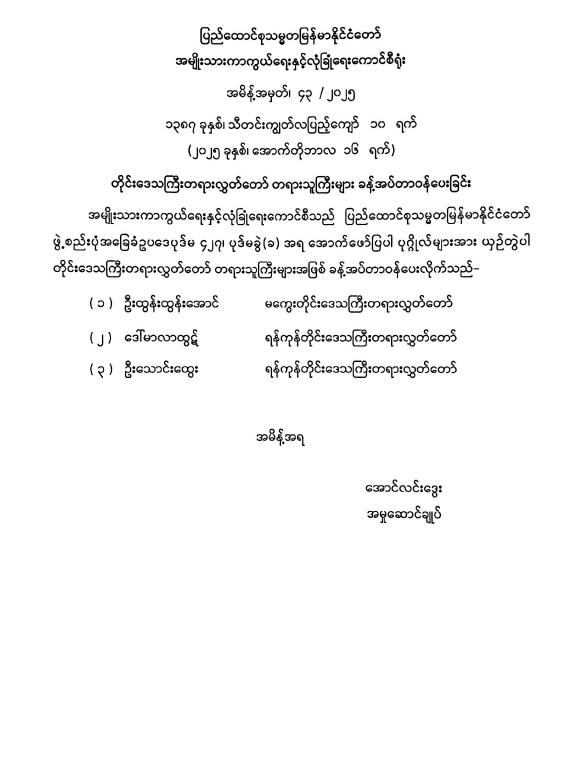 တိုင်းဒေသကြီးတရားလွှတ်တော် တရားသူကြီးများခန့်အပ်တာဝန်ပေးအပ်ခြင်း
