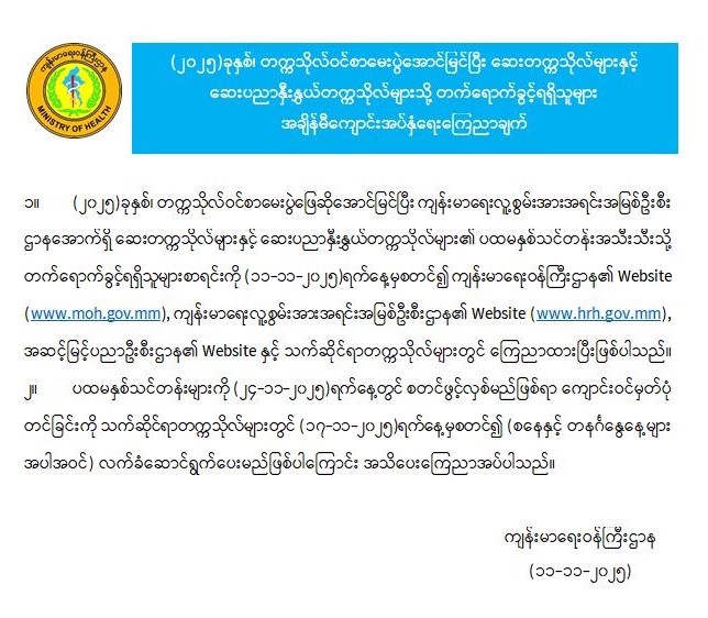 (၂ဝ၂၅) ခုနှစ်၊ တက္ကသိုလ်ဝင်စာမေးပွဲအောင်မြင်ပြီး ဆေးတက္ကသိုလ်များနှင့် ဆေးပညာနှီးနွယ်တက္ကသိုလ်များသို့ တက်ရောက်ခွင့်ရရှိသူများ အချိန်မီကျောင်းအပ်နှံရေး ကြေညာချက် 11/11/2025