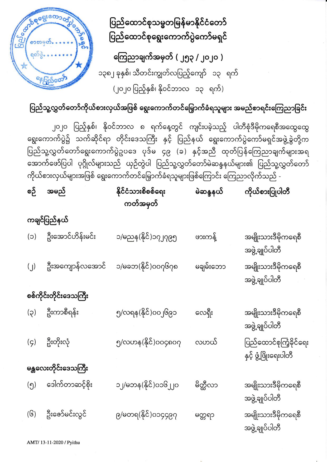 ပြည်သူ့လွှတ်တော်ကိုယ်စားလှယ်အဖြစ် ရွေးကောက်တင်မြှောက်ခံရသူများ အမည်စာရင်းကြေညာခြင်း