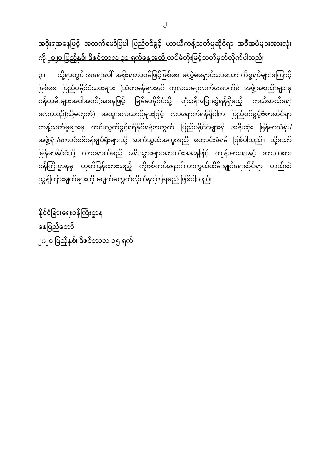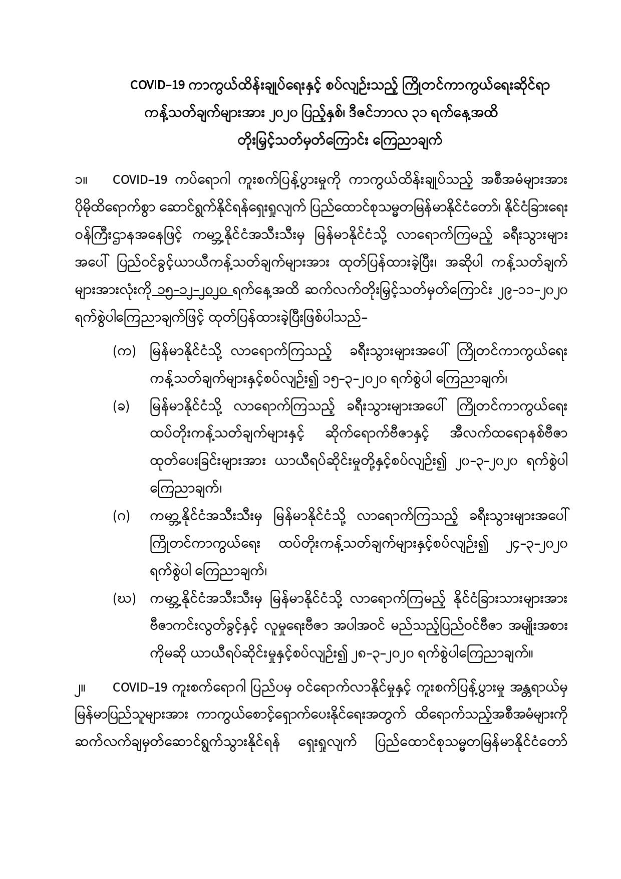 COVID-19 ကာကွယ်ထိန်းချုပ်ရေးနှင့် စပ်လျဉ်းသည့် ကြိုတင်ကာကွယ်ရေး ဆိုင်ရာ ကန့်သတ်ချက်များအား ၂၀၂၀ ပြည့်နှစ်၊ ဒီဇင်ဘာလ ၃၁ ရက်နေ့အထိ တိုးမြှင့်သတ်မှတ်ကြောင်း ကြေညာချက် 12/15/2020