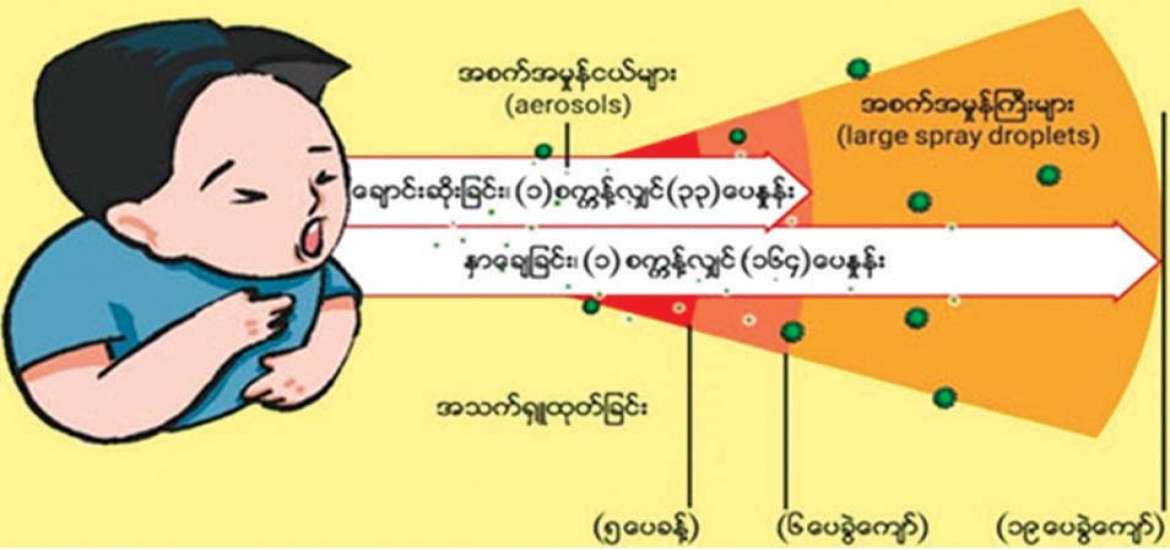 ကိုရိုနာဗိုင်းရပ်စ် (ကိုဗစ် -၁၉) ရောဂါပိုးပါဝင်နိုင်သည့် အစက်အမှုန်ငယ် (droplets) များသည် အသက်ရှူထုတ်ခြင်းမှတစ်ဆင့် အနီးပတ်ဝန်းကျင် ငါးပေခန့်အထိလည်းကောင်း၊ ချောင်းဆိုးခြင်းမှတစ်ဆင့် တစ်စက္ကန့်လျှင် ၃၃ ပေနှုန်းအရှိန်ဖြင့် ခြောက်ပေခွဲခန့်အထိ၊ နှာချေခြင်းမှတစ်ဆင့် တစ်စက္ကန့် လျှင် ၁၆၄ ပေနှုန်းအရှိန်ဖြင့် ၁၉ ပေခွဲခန့်အထိ ရောက်ရှိနိုင်ပါသည်။ လတ်တလော သုတေသန တွေ့ရှိချက်များအရ အဆိုပါအစက်အမှုန်ငယ် (droplets) များသည် ပလတ်စတစ်ဘူးခွံများပေါ်တွင် ငါးရက်ခန့်၊ မှန်/ သစ်သား/စက္ကူ တို့ပေါ်တွင် (၄-၅) ရက်ခန့်၊ စတီးပစ္စည်း (Stainless Steel) များပေါ်တွင် ၄၈ နာရီခန့် ရှင်သန်နေထိုင်နိုင်ပါသည်။ ထို့အပြင် ကိုဗစ် - ၁၉ ဗိုင်းရပ်စ်ပိုး၏ မျိုးရိုး ဗီဇပြောင်းလဲမှုများကြောင့် ပိုး၏ကူးစက်နိုင်မှု (infectivity) သည် ယခင်မျိုးရိုးဗီဇ ရှိသောပိုးနှင့် နှိုင်းယှဉ်လျှင် ၁၀ ဆ ခန့်အထိ မြင့်မားလာကြောင်း သိရှိရပါသည်။