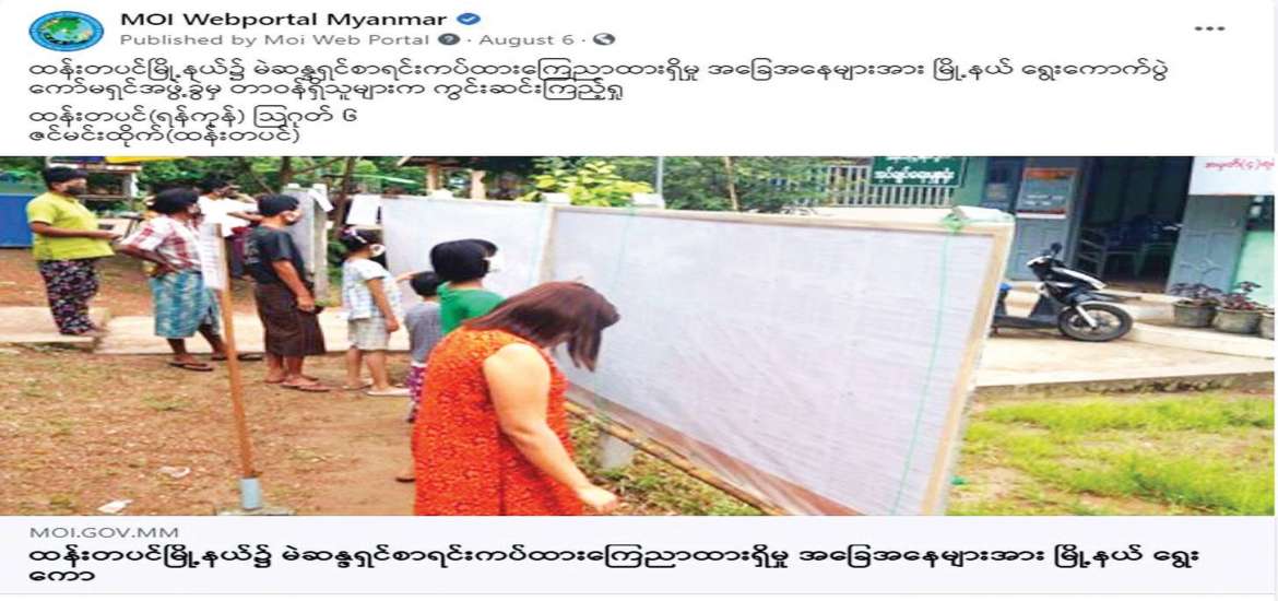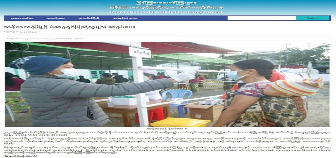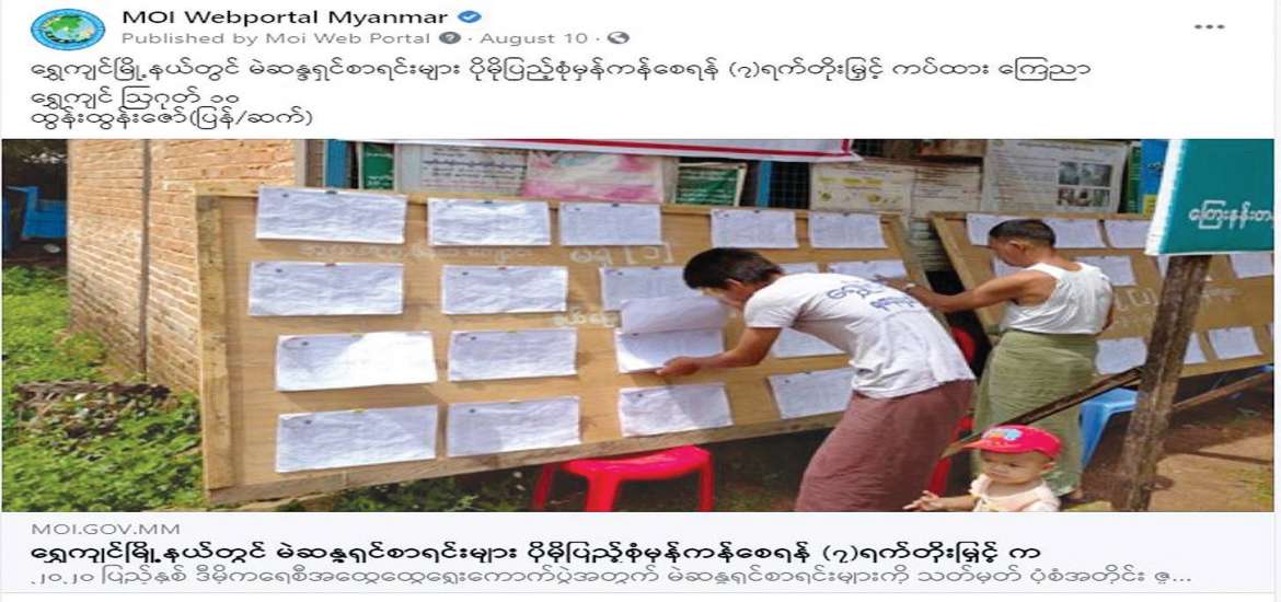 ထိုနည်းတူ တိုင်းဒေသကြီး၊ ပြည်နယ်၊ ခရိုင်၊ မြို့နယ် ပြန်ကြားရေးနှင့် ပြည်သူ့ဆက်ဆံရေး ဦးစီးဌာနရုံးများက Facebook Pages ၄၃၅ ခုတွင် မိမိတို့ ဒေသအလိုက် ဆောင်ရွက်သည့် ရွေးကောက်ပွဲဆိုင်ရာ လှုပ်ရှားမှုများကို သတင်းရိုက်ကူးထုတ်လွှင့်မှု ၆၂၉၀ နှင့် MOI Website၊ MRTV နှင့် သတင်းစာတို့မှ ရွေးကောက်ပွဲဆိုင်ရာ ကြေညာချက်များကို ထပ်ဆင့်မျှဝေမှု ၂၆၇၆၂ ပုဒ်၊ စုစုပေါင်း ၃၃၀၅၂ ပုဒ်ကို ပြည်သူများသိရှိအောင် ဖော်ပြပေးခဲ့ပါသည်။ ထို့ပြင် ဒို့ကျေးရွာဂျာနယ်တွင် ရွေးကောက်ပွဲဆိုင်ရာ အသိအမြင် ဆောင်းပါး ၂၂ ပုဒ်ကို ရေးသားဖော်ပြပေး ခဲ့သည်။