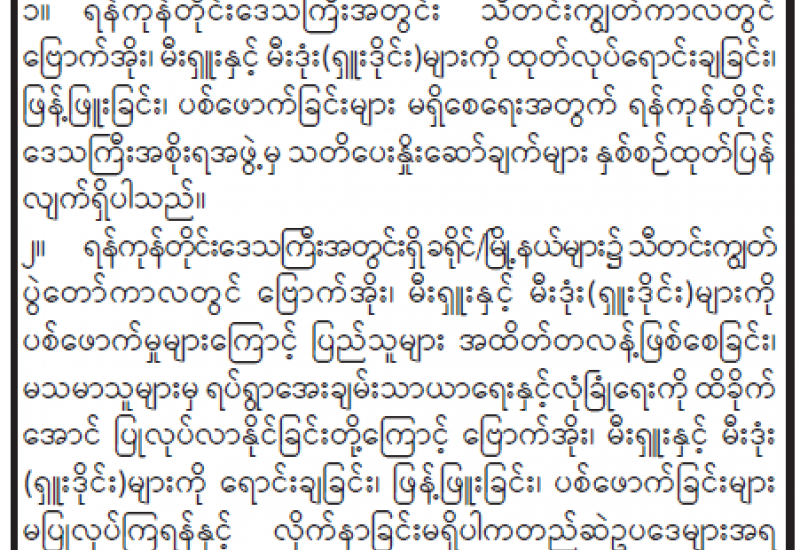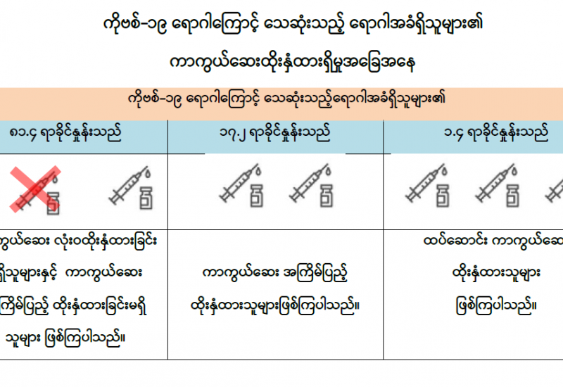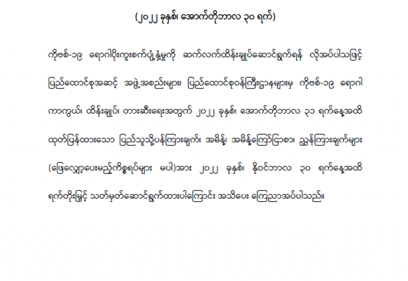 ကျန်းမာရေးဝန်ကြီးဌာနအနေဖြင့် နိုင်ငံအတွင်း ကူးစက်ဖြစ်ပွားနေသော COVID-19 ရောဂါ ကာကွယ်၊ ကုသ၊ ထိန်းချုပ်ရေးလုပ်ငန်းများကို အရှိန်အဟုန်မပြတ် ဆောင်ရွက်လျက်ရှိရာ ရောဂါ ထိန်းချုပ်ရေးလုပ်ငန်းများ အောင်မြင်နိုင်ရေးအတွက် ပြည်သူလူထုအနေဖြင့် ကျန်းမာရေးဝန်ကြီး ဌာနမှ ထုတ်ပြန်ထားသော COVID-19 ရောဂါကာကွယ်ထိန်းချုပ်ရေးဆိုင်ရာ စည်းကမ်းများကို စနစ်တကျ လိုက်နာဆောင်ရွက်ရန် လိုအပ်ပြီး COVID-19 ကာကွယ်ဆေးထိုးနှံမှုခံယူခြင်းအား အထူးဂရုပြု ပူးပေါင်းဆောင်ရွက်ကြရန် လိုအပ်ပါသည်။