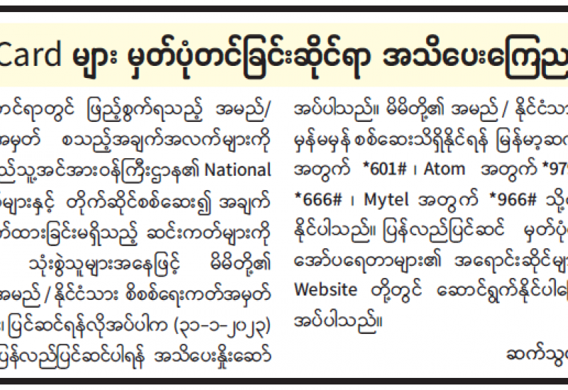 SIM Card များ မှတ်ပုံတင်ခြင်းဆိုင်ရာ အသိပေးကြေညာချက်