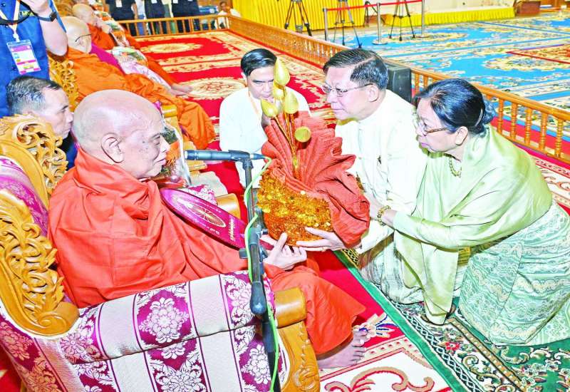 ၂၀၂၄ ခုနှစ်၊ ကာကွယ်ရေးဦးစီးချုပ်ရုံး (ကြည်း၊ ရေ၊ လေ) မိသားစုများ ဝါဆိုသင်္ကန်းဆက်ကပ်လှူဒါန်းပွဲ မဟာမင်္ဂလာအခမ်းအနားကို ယနေ့နံနက်ပိုင်းတွင် ကာကွယ်ရေးဦးစီးချုပ်ရုံး (ကြည်း)၊ အနော်ရထာခန်းမ၌ ကျင်းပပြုလုပ်ရာ နိုင်ငံတော်စီမံအုပ်ချုပ်ရေးကောင်စီဥက္ကဋ္ဌ တပ်မတော်ကာကွယ်ရေးဦးစီးချုပ် ဗိုလ်ချုပ်မှူးကြီး မင်းအောင်လှိုင်နှင့် ဇနီး ဒေါ်ကြူကြူလှတို့ တက်ရောက်ကြည်ညို၍ ဝါဆိုသင်္ကန်း၊ လှူဖွယ်ပစ္စည်းများနှင့် နေ့ဆွမ်းတို့ကို ဆက်ကပ်လှူဒါန်းသည်။