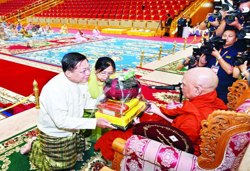 ၂၀၂၄ ခုနှစ် သာသနာတော်ဆိုင်ရာ ဘွဲ့တံဆိပ်တော်များ ဆက်ကပ်ပူဇော်ပွဲ မဟာမင်္ဂလာအခမ်းအနားနှင့် ဆွမ်းဆန်စိမ်းလောင်းလှူပွဲအခမ်းအနားကို ယနေ့မွန်းလွဲပိုင်းတွင် နေပြည်တော်၊ မာရဝိဇယဗုဒ္ဓဥယျာဉ်တော်ပရိဝုဏ်အတွင်းရှိ အဂ္ဂါဓိပတိသာသနာ့ဗိမာန်တော်ကြီး၌ ကျင်းပရာ နိုင်ငံတော်စီမံအုပ်ချုပ်ရေးကောင်စီဥက္ကဋ္ဌ နိုင်ငံတော်ဝန်ကြီးချုပ် ဗိုလ်ချုပ်မှူးကြီး မင်းအောင်လှိုင်နှင့် ဇနီး ဒေါ်ကြူကြူလှတို့ တက်ရောက်ကြည်ညို၍ သာသနာတော်ဆိုင်ရာ ဘွဲ့တံဆိပ်တော်များ ဆက်ကပ်ပူဇော်ပြီး ဆွမ်းဆန်စိမ်းများ လောင်းလှူကြသည်။