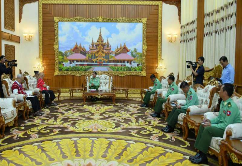 နိုင်ငံတော်စီမံအုပ်ချုပ်ရေးကောင်စီဥက္ကဋ္ဌ တပ်မတော်ကာကွယ်ရေးဦးစီးချုပ် ဗိုလ်ချုပ်မှူးကြီးမင်းအောင်လှိုင်အား တစ်နိုင်ငံလုံး ပစ်ခတ်တိုက်ခိုက်မှုရပ်စဲရေး သဘောတူစာချုပ်(NCA) (၈)နှစ်မြောက် နှစ်ပတ်လည်နေ့အခမ်းအနားသို့ တက်ရောက်ခဲ့သော တိုင်းရင်းသားလက်နက်ကိုင်ကိုယ်စားလှယ်အဖွဲ့များက ယနေ့နံနက်ပိုင်းတွင် နေပြည်တော်ရှိ ဘုရင့်နောင်ရိပ်သာ၊ ဧည့်ခန်းမဆောင်၌ လာရောက်ဂါရဝပြုတွေ့ဆုံသည်။