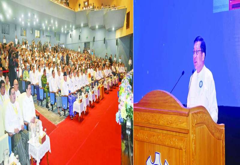 ပြည်ထောင်စုသမ္မတမြန်မာနိုင်ငံ ကုန်သည်များနှင့် စက်မှုလက်မှုလုပ်ငန်းရှင်များ အသင်းချုပ် (၃၄) ကြိမ်မြောက် နှစ်ပတ်လည်အသင်းသားစုံညီအစည်းအဝေးကို ယနေ့မွန်းလွဲပိုင်းတွင် ရန်ကုန်မြို့ရှိ အမျိုးသားကဇတ်ရုံ၌ ကျင်းပပြုလုပ်ရာ ပြည်ထောင်စုသမ္မတမြန်မာနိုင်ငံတော် ယာယီသမ္မတနိုင်ငံတော်လုံခြုံရေးနှင့် အေးချမ်းသာယာရေးကော်မရှင်ဥက္ကဋ္ဌ ဗိုလ်ချုပ်မှူးကြီး မင်းအောင်လှိုင် တက်ရောက်အမှာစကားပြောကြားသည်။