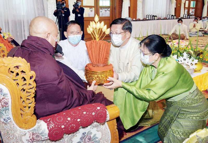 ပြည်ထောင်စုသမ္မတမြန်မာနိုင်ငံတော်၊ နိုင်ငံတော်စီမံအုပ်ချုပ်ရေးကောင်စီ ၂၀၂၁ ခုနှစ် ကထိန်သင်္ကန်း ဆက်ကပ်လှူဒါန်းပွဲ အခမ်းအနားကို ယနေ့နံနက်ပိုင်းတွင် နေပြည်တော်ရှိ ဥပ္ပါတသန္တိစေတီတော်၊ သာသနာ့မဟာဗိမာန်တော်၌ ကျင်းပပြုလုပ်ရာ နိုင်ငံတော်စီမံအုပ်ချုပ်ရေး ကောင်စီဥက္ကဋ္ဌ နိုင်ငံတော်ဝန်ကြီးချုပ် ဗိုလ်ချုပ်မှူးကြီး မင်းအောင်လှိုင်နှင့် ဇနီးဒေါ်ကြူကြူလှတို့ တက်ရောက်၍ ကထိန်လျာသင်္ကန်းနှင့် လှူဖွယ်ပစ္စည်းများ ဆက်ကပ်လှူဒါန်းသည်။