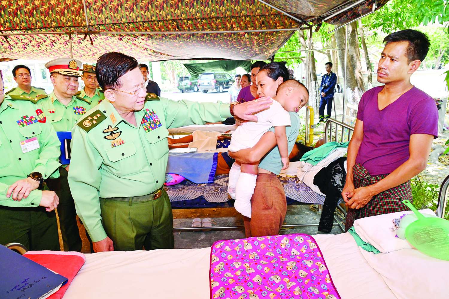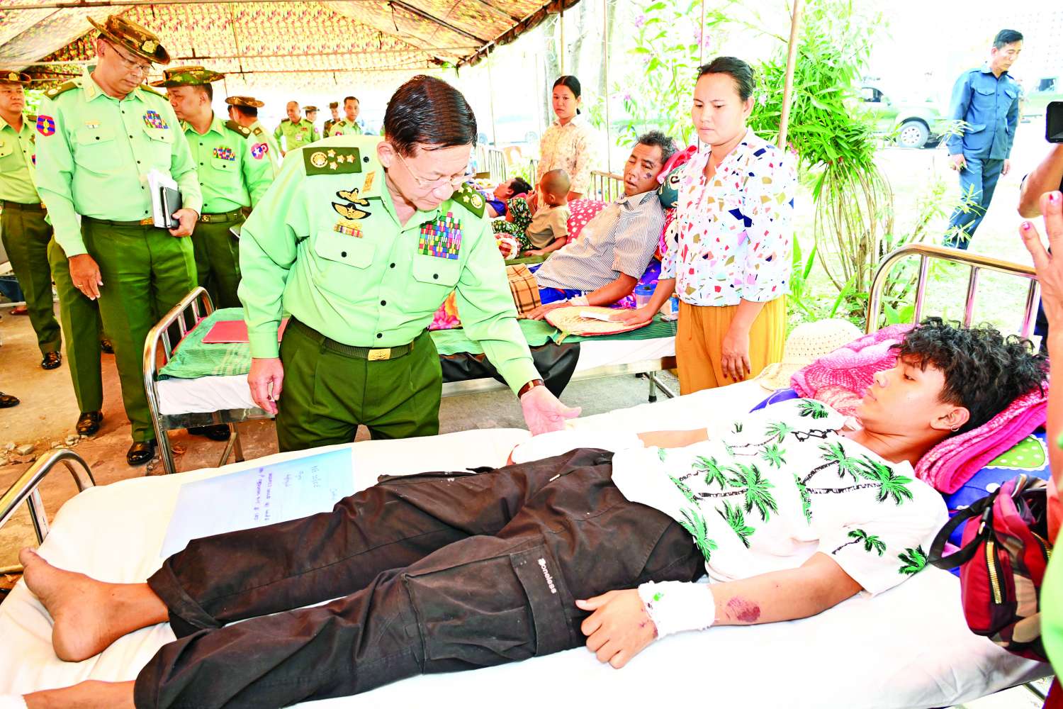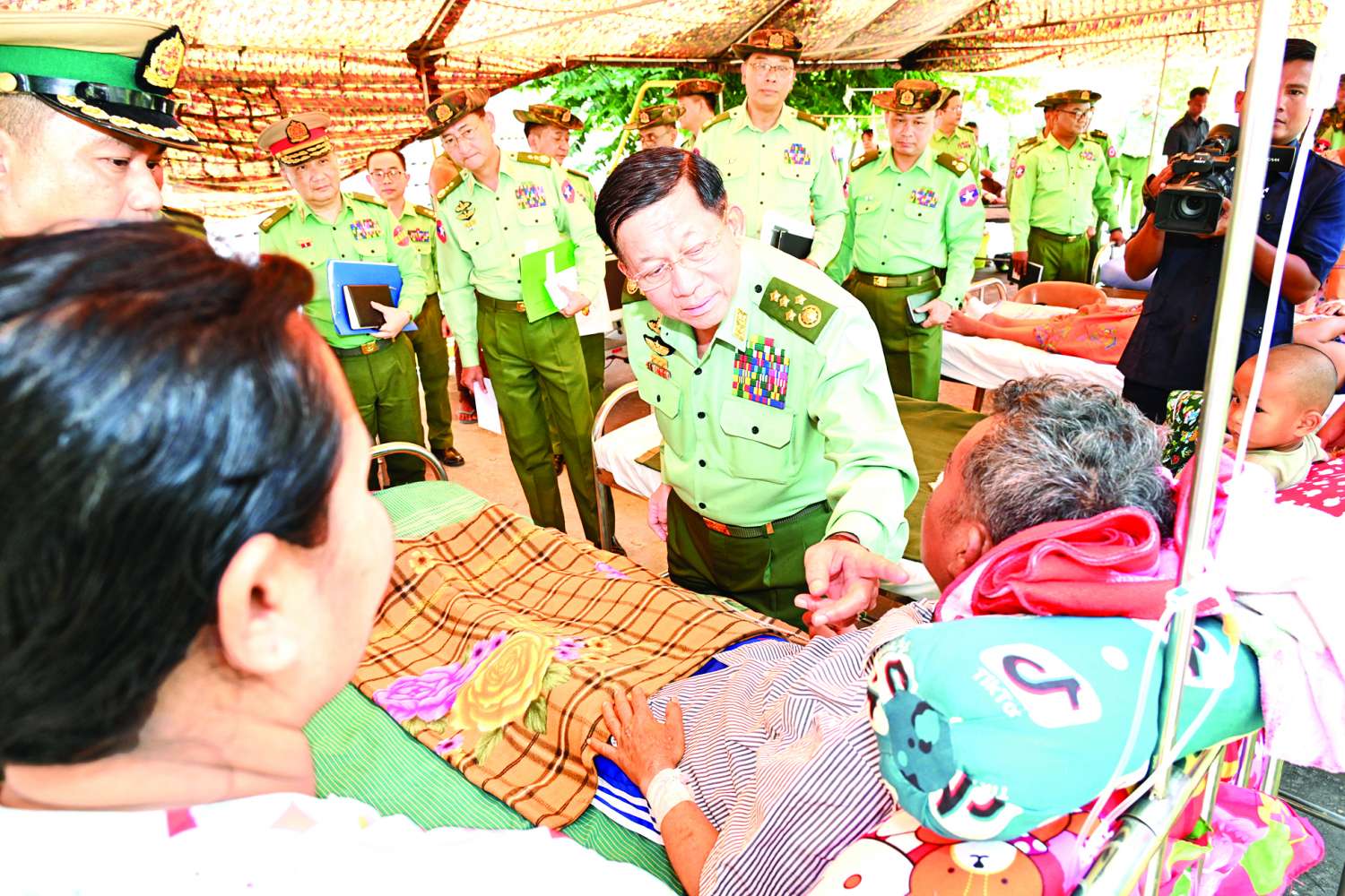 နိုင်ငံတော်စီမံအုပ်ချုပ်ရေးကောင်စီဥက္ကဋ္ဌ တပ်မတော်ကာကွယ်ရေးဦးစီးချုပ် ဗိုလ်ချုပ်မှူးကြီး မင်းအောင်လှိုင်သည် ကာကွယ်ရေးဦးစီးချုပ်ရုံးမှ အဆင့်မြင့်တပ်မတော်အရာရှိကြီးများ လိုက်ပါ၍ ယနေ့နံနက်ပိုင်းတွင် နေပြည်တော်ရှိ တပ်မတော်ဆေးရုံကြီး ထိခိုက်ဒဏ်ရာနှင့် အရိုးရောဂါကုသဆောင်၌ ငလျင်ဘေးဒဏ်ကြောင့် ထိခိုက်ဒဏ်ရာရရှိခဲ့သည့် ပြည်သူများနှင့် နိုင်ငံ့ဝန်ထမ်းများ၊ တပ်မတော်သားများနှင့် မိသားစုဝင်များအား ဆေးဝါးကုသပေးထားမှုအခြေအနေများကို သွားရောက်ကြည့်ရှုစစ်ဆေးသည်။