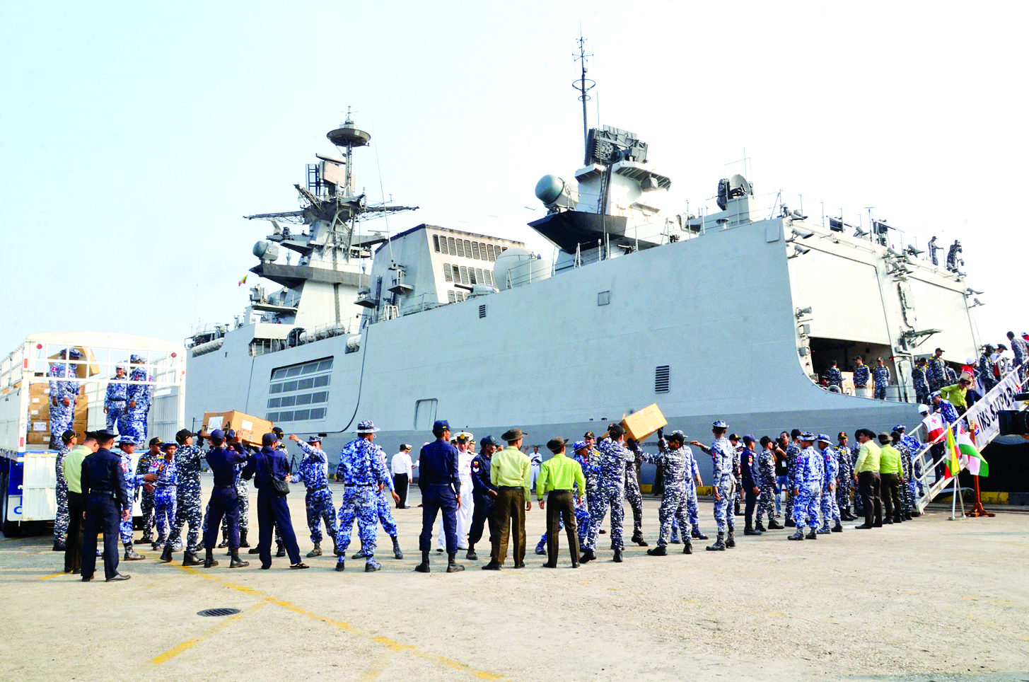 မတ် ၂၈ ရက်တွင် အင်အားပြင်းမြေငလျင်လှုပ်ခတ်မှုကြောင့် မြန်မာနိုင်ငံတစ်ဝန်း ငလျင်ဒဏ်သင့်ပြည်သူများအား ကူညီကယ်ဆယ်ရေးနှင့် ပြန်လည်ထူထောင်ရေးလုပ်ငန်းများ ဆောင်ရွက်ရာတွင် အသုံးပြုနိုင်ရန်အတွက် အိန္ဒိယနိုင်ငံမှ လူသားချင်းစာနာထောက်ထားမှုဆိုင်ရာအကူအညီများ ပေးအပ်ရန် ကူညီကယ်ဆယ်ရေးပစ္စည်းများနှင့် စားသောက်ဖွယ်ရာများ တင်ဆောင်လာသော အိန္ဒိယရေတပ်မှ စစ်ရေယာဉ်နှစ်စင်းသည် ယနေ့မွန်းလွဲ ၂ နာရီခွဲက ရန်ကုန်မြို့ရှိ သီလဝါဆိပ်ကမ်းသို့ ရောက်ရှိလာရာ တပ်မတော် (ရေ) မှ အရာရှိကြီးများနှင့် တာဝန်ရှိသူများက ကြိုဆိုနှုတ်ဆက်ခဲ့ကြသည်။