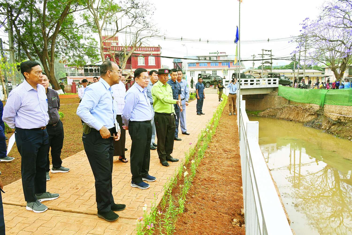 ထို့နောက် နိုင်ငံတော်စီမံအုပ်ချုပ်ရေးကောင်စီဥက္ကဋ္ဌ နိုင်ငံတော် ဝန်ကြီးချုပ်သည် ကလောချောင်းတစ်လျှောက် ရေစီးရေလာကောင်းမွန်မှုရှိစေရေး ချောင်းချဲ့ခြင်းနှင့် တူးဖော်ခြင်းလုပ်ငန်းဆောင်ရွက်ထားရှိမှု အခြေအနေများနှင့် မြေယာရှုခင်းဖော်ဆောင်နေမှုအခြေအနေများကို လိုက်လံကြည့်ရှုစစ်ဆေးပြီး တာဝန်ရှိသူများ၏ တင်ပြချက်များအပေါ် လိုအပ်သည်များ မှာကြားသည်။