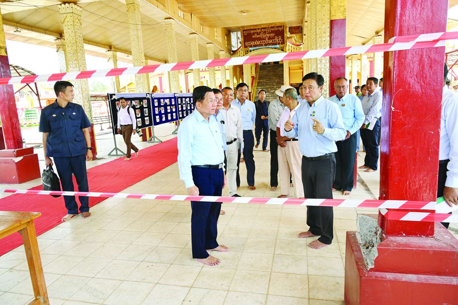 ယင်းနောက် နိုင်ငံတော်စီမံအုပ်ချုပ်ရေးကောင်စီဥက္ကဋ္ဌ နိုင်ငံတော်ဝန်ကြီးချုပ်နှင့်အဖွဲ့ဝင်များသည် အင်းလေးဖောင်တော်ဦးမြတ်စွာဘုရားသို့ ရောက်ရှိကြပြီး ငလျင်ဒဏ်ကြောင့် သာသနိကအဆောက်အအုံများ ထိခိုက်ပျက်စီးခဲ့ရမှုများကို ကြည့်ရှုစစ်ဆေးရာ တာဝန်ရှိသူများက လိုက်လံရှင်းလင်းတင်ပြကြသည်။ ရှင်းလင်းတင်ပြမှုများအပေါ် အင်းလေးဖောင်တော်ဦးမြတ်စွာဘုရား ပင်မစံကျောင်းတော်ကြီး ရေရှည်ကြံ့ခိုင်မှုရှိစေရေးအတွက် ပြုပြင် ထိန်းသိမ်းရေးလုပ်ငန်းများဆောင် ရွက်ရန်လိုအပ်သည့် ကျောက်၊ သဲ၊ သံချောင်းများနှင့် ဘိလပ်မြေတို့ကို အမြန်ဆုံးရောက်ရှိအောင် ဆောင်ရွက်သွားရန်လိုကြောင်း၊ စံကျောင်းတော်ကြီးရှိ အောက်ခြေတိုင်များ ကြံ့ခိုင်မှုရှိစေရေး မြန်မြန်ဆန်ဆန်ဖြင့် စနစ်တကျဆောင် ရွက်သွားရန်လိုကြောင်း၊ ငလျင်ဒဏ်ကြောင့် မြေကာနံရံများ၌ မြေပြိုကျခဲ့သည့် နေရာများအား Sheet Pile များဖြင့် အမြန်ဆုံးပြန်လည်ပြုပြင်ဆောင်ရွက်သွားရန်လိုကြောင်း၊ ပြုပြင်ရေးလုပ်ငန်း များအား နှစ်စဉ်ကျင်းပနေကျဖြစ်သည့် အင်းလေးဖောင်တော်ဦး မြတ်စွာဘုရား ဒေသစာရီကြွချီ ပူဇော်ခံပွဲမတိုင်မီ ပြီးစီးအောင်ဆောင်ရွက်သွားရန် လိုကြောင်းနှင့် အခြားလိုအပ်သည်များကို မှာကြားသည်။