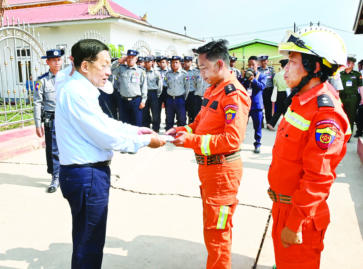 ၎င်းနောက် နိုင်ငံတော်စီမံအုပ်ချုပ်ရေးကောင်စီဥက္ကဋ္ဌ နိုင်ငံတော်ဝန်ကြီးချုပ်က ကူညီကယ်ဆယ်ရေး လုပ်ငန်းများဆောင်ရွက်နေသည့် မြန်မာနိုင်ငံရဲတပ်ဖွဲ့ဝင်များနှင့် မီးသတ်တပ်ဖွဲ့ဝင်များအား ချီးမြှင့်ငွေများပေးအပ်ခဲ့ကြောင်း သတင်းရရှိသည်။
