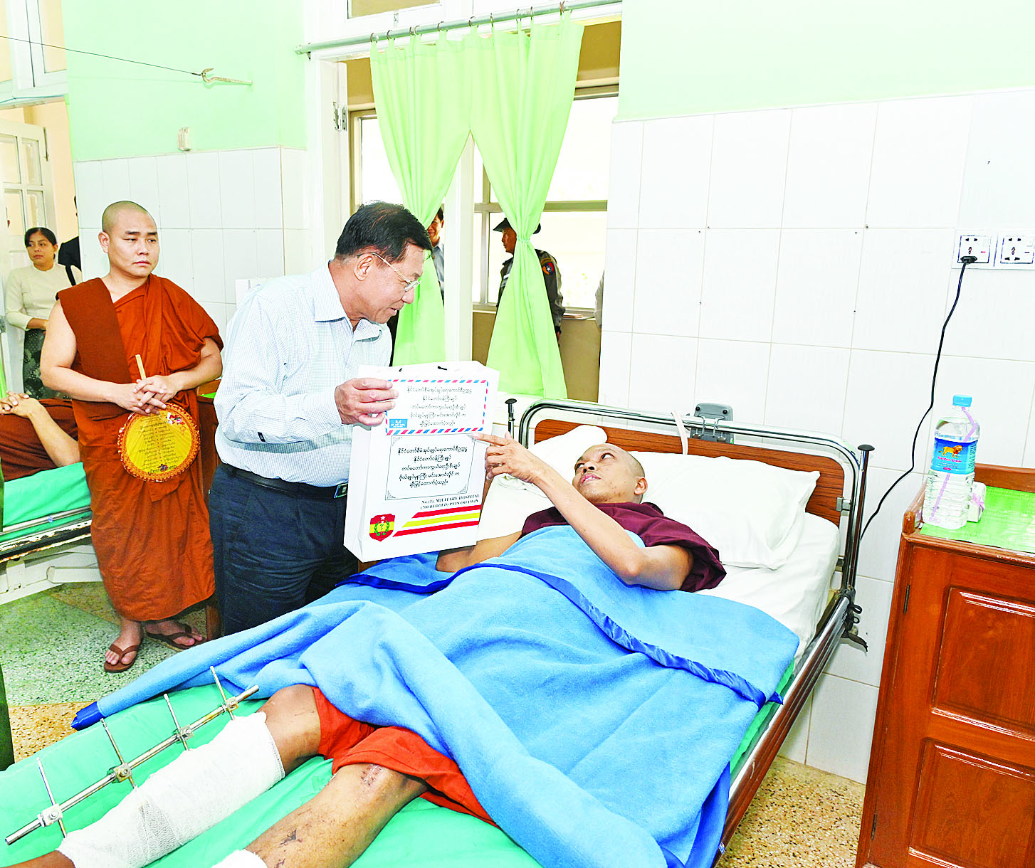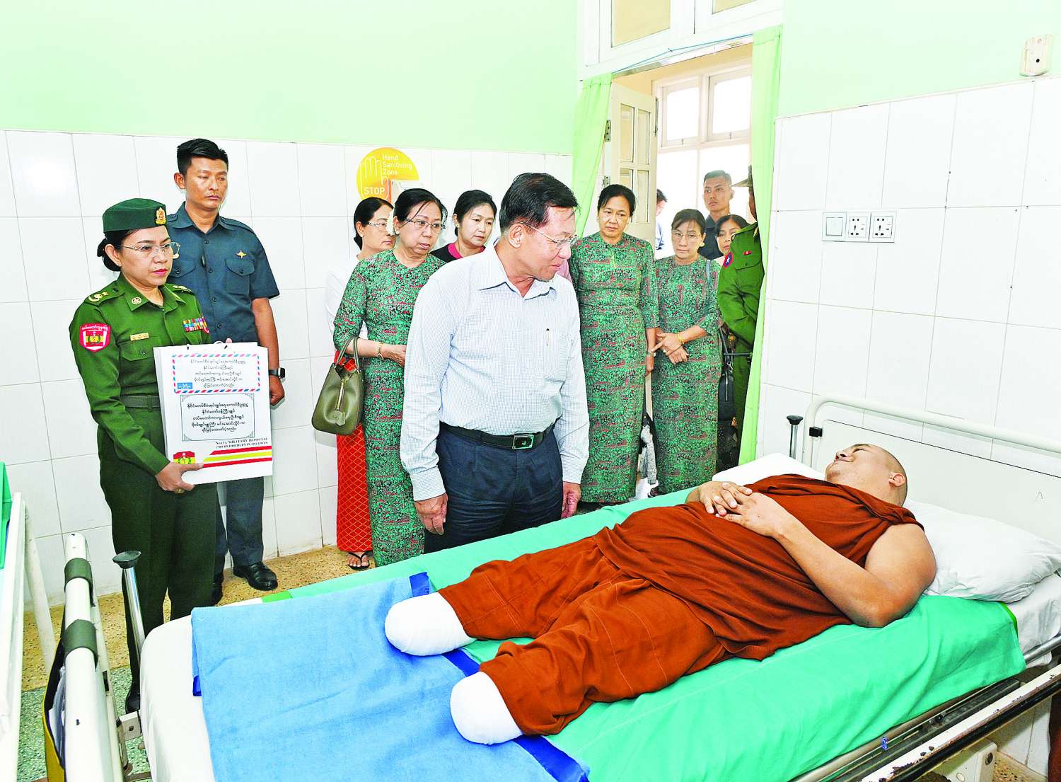 ထို့နောက် နိုင်ငံတော်စီမံအုပ်ချုပ်ရေးကောင်စီဥက္ကဋ္ဌ နိုင်ငံတော်ဝန်ကြီးချုပ်နှင့် ဇနီးတို့သည် ငလျင်ဘေးဒဏ်ကြောင့် ထိခိုက်ဒဏ်ရာရရှိခဲ့သဖြင့် ဆေးရုံအထူးကြပ်မတ် ကုသဆောင်အတွင်း ကုသမှုခံယူရလျက်ရှိသည့် ဆရာတော်တစ်ပါးနှင့် အရပ်သားပြည်သူ နှစ်ဦးတို့အား သွားရောက်ကြည့်ရှုအားပေးစကားပြောကြားပြီး အာဟာရဖြည့်စား သောက်ဖွယ်ရာများနှင့် နဝကမ္မအလှူတော်ငွေများကို ဆက်ကပ်လှူဒါန်းပေးအပ်သည်။