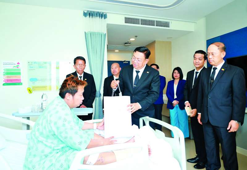 နိုင်ငံတော်စီမံအုပ်ချုပ်ရေးကောင်စီဥက္ကဋ္ဌ နိုင်ငံတော်ဝန်ကြီးချုပ် ဗိုလ်ချုပ်မှူးကြီး မင်းအောင်လှိုင်နှင့်အတူ ထိုင်းနိုင်ငံ ဗန်ကောက်မြို့သို့ ရောက်ရှိနေသည့် နိုင်ငံတော်စီမံအုပ်ချုပ်ရေးကောင်စီဥက္ကဋ္ဌရုံးဝန်ကြီးဌာန(၁) ပြည်ထောင်စုဝန်ကြီး ဗိုလ်ချုပ်ကြီး မိုးအောင်သည် ဒုတိယဝန်ကြီးများလိုက်ပါ၍ ယနေ့ဒေသစံတော်ချိန် မွန်းလွဲပိုင်းတွင် မတ် ၂၈ ရက်၌ ထိုင်းနိုင်ငံ၌ ငလျင်လှုပ်ခတ်မှုဖြစ်ပွားစဉ်အတွင်း အဆောက်အအုံပြိုကျမှုကြောင့် ထိခိုက်ဒဏ်ရာရရှိပြီး Phyathai Phaholyothin Hospital ၌ ဆေးကုသမှုခံယူလျက်ရှိသည့် မြန်မာနိုင်ငံသားများအား သွားရောက်ကြည့်ရှုအားပေးစကားပြောကြားသည်။