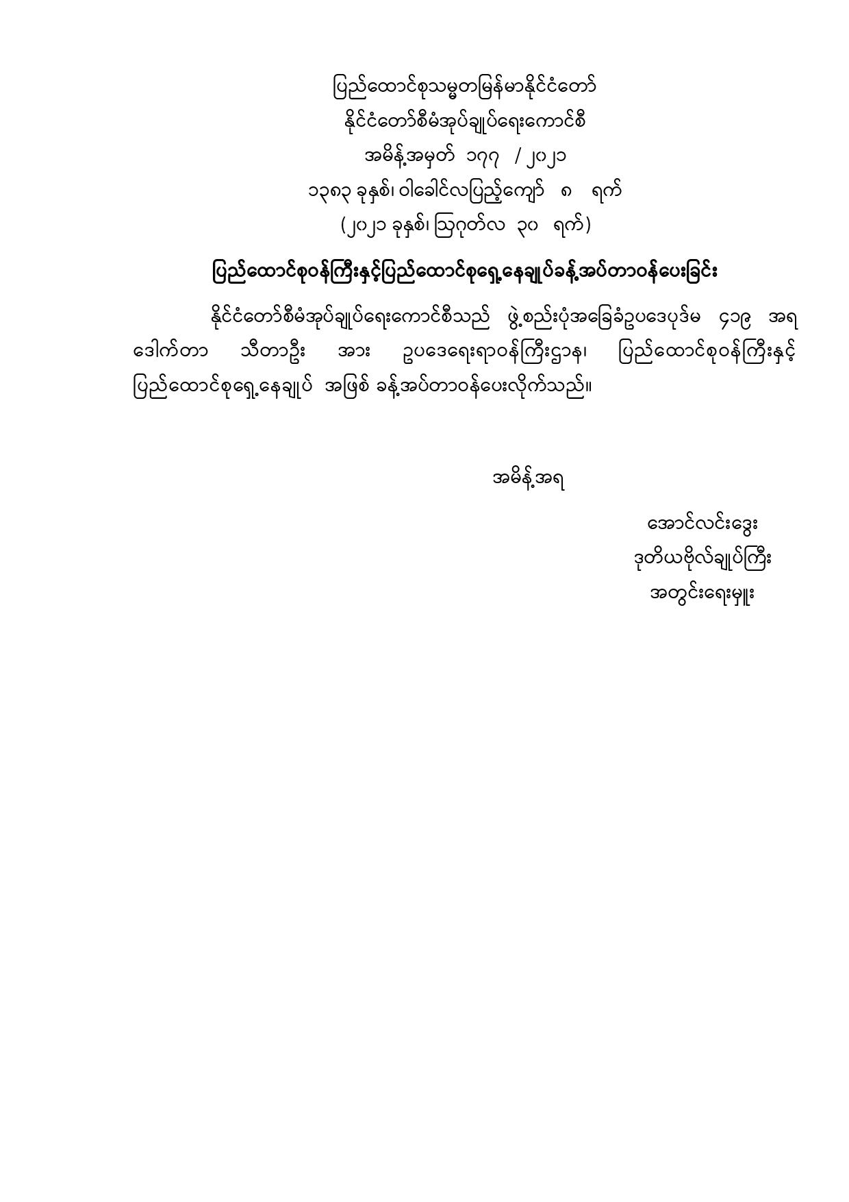 ပြည်ထောင်စုဝန်ကြီးနှင့် ပြည်ထောင်စုရှေ့နေချုပ် ခန့်အပ်တာဝန်ပေးခြင်း