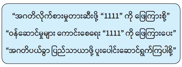၃။ အများပြည်သူထံမှ တုံ့ပြန်မှုရယူခြင်းအစီအစဉ်အရ အဂတိလိုက်စားမှုတိုက်ဖျက်ရေးကော်မရှင်နှင့် ပြည်ထောင်စုဝန်ကြီးဌာန/ အဖွဲ့ အစည်းများထံမှ Short Code နံပါတ် “1111” ဖြင့် ဝန်ဆောင်မှု ရယူစဉ်က ကြုံတွေ့ခဲ့ရသည့် အခြေအနေများနှင့်စပ်လျဉ်း၍ ပေးပို့မေးမြန်းလိုက်သော SMS များကို မှန်ကန်စွာ ပြန်လည်ဖြေကြားပေးခြင်းဖြင့် သက်ဆိုင်ရာဌာနအသီးသီး၏ ဝန်ဆောင်မှုလုပ်ငန်း အရည်အသွေးကို သိရှိနိုင်မည်ဖြစ်ပြီး အဂတိလိုက်စားမှု တားဆီးကာကွယ်ရေးအတွက် လိုအပ်ချက်များကို ပြုပြင်နိုင်မည်ဖြစ်ပါသည်။