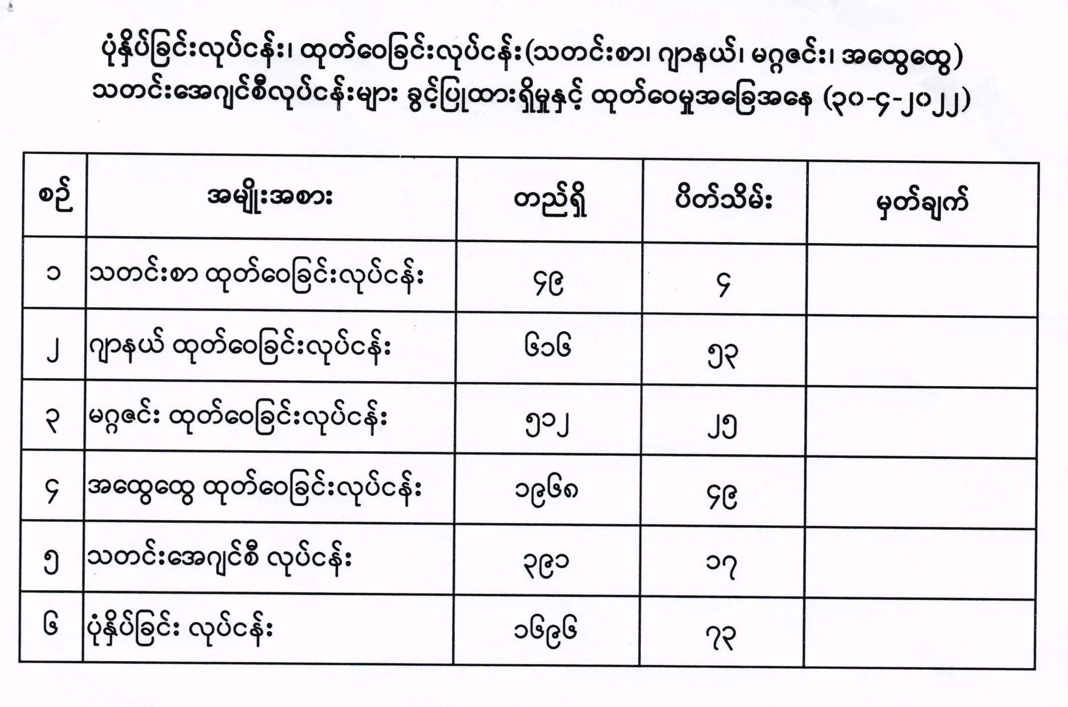 ပုံနှိပ်ခြင်းလုပ်ငန်း၊ ထုတ်ဝေခြင်းလုပ်ငန်း(သတင်းစာ၊ ဂျာနယ်၊ မဂ္ဂဇင်း၊ အထွေထွေ) သတင်းအေဂျင်စီလုပ်ငန်းများ ခွင့်ပြုထားရှိမှုနှင့် ထုတ်ဝေမှုအခြေအနေ(၃၀-၄-၂၀၂၂)